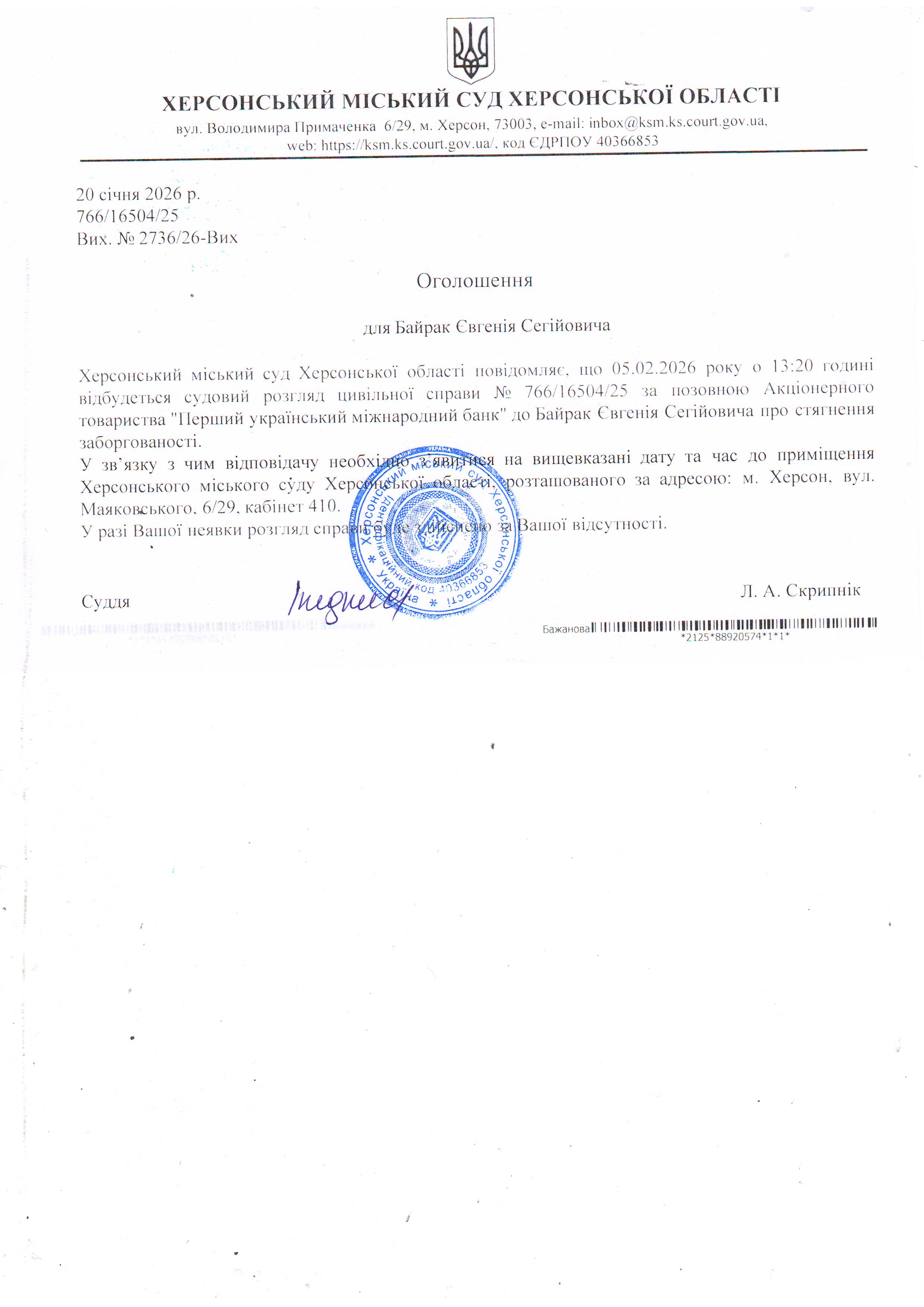 ОГОЛОШЕННЯ ПРО ВИКЛИК ДО СУДУ