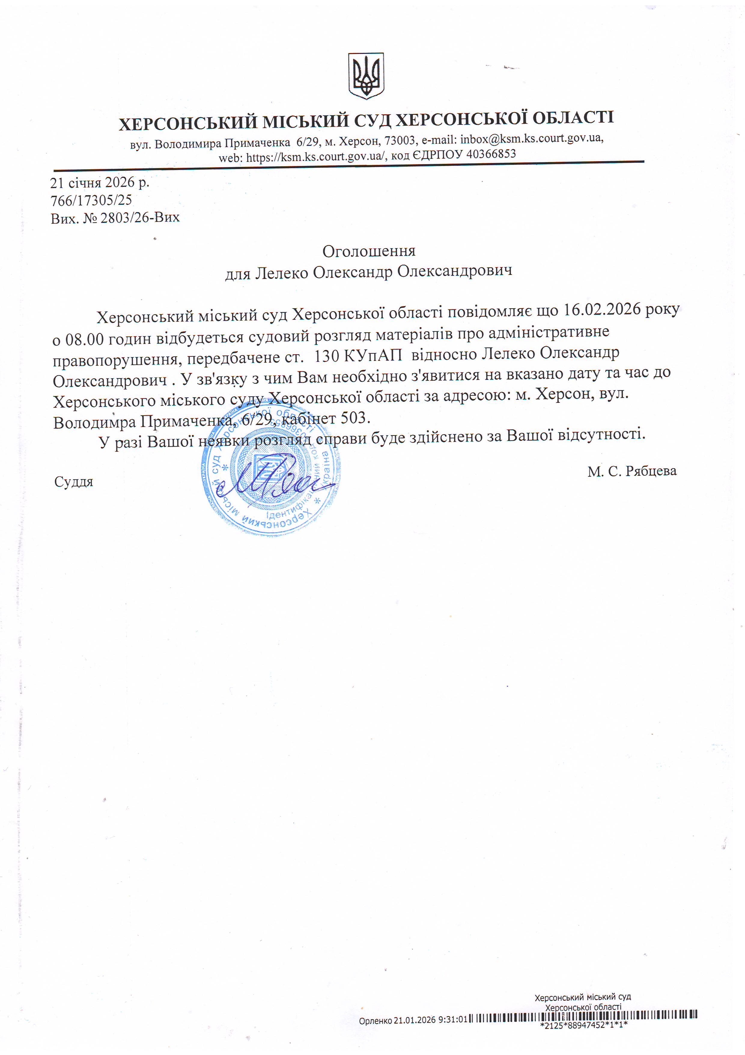 Оголошення про виклик особи в суд та повідомлення про судове рішення