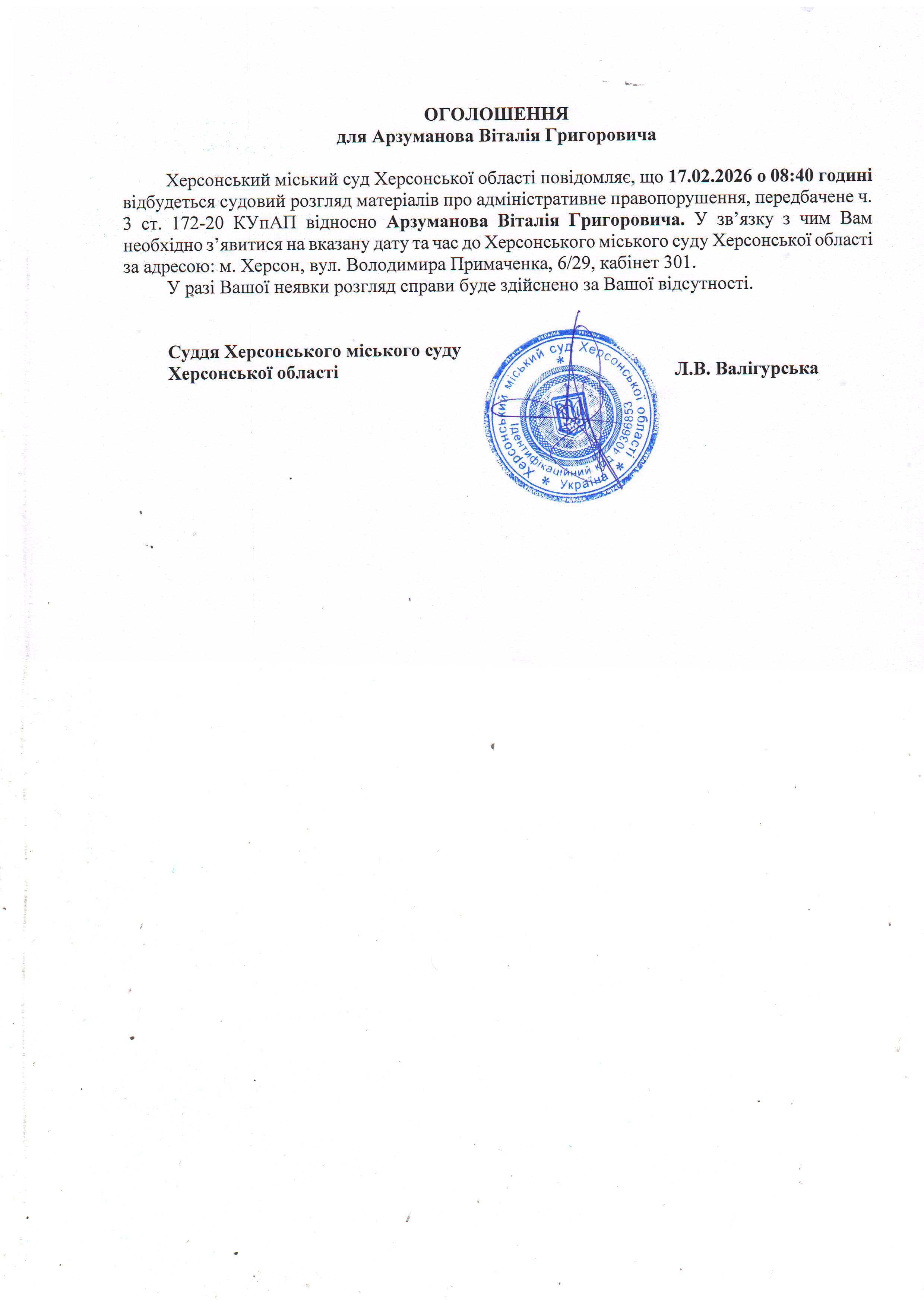 ОГОЛОШЕННЯ ПРО ВИКЛИК ДО СУДУ