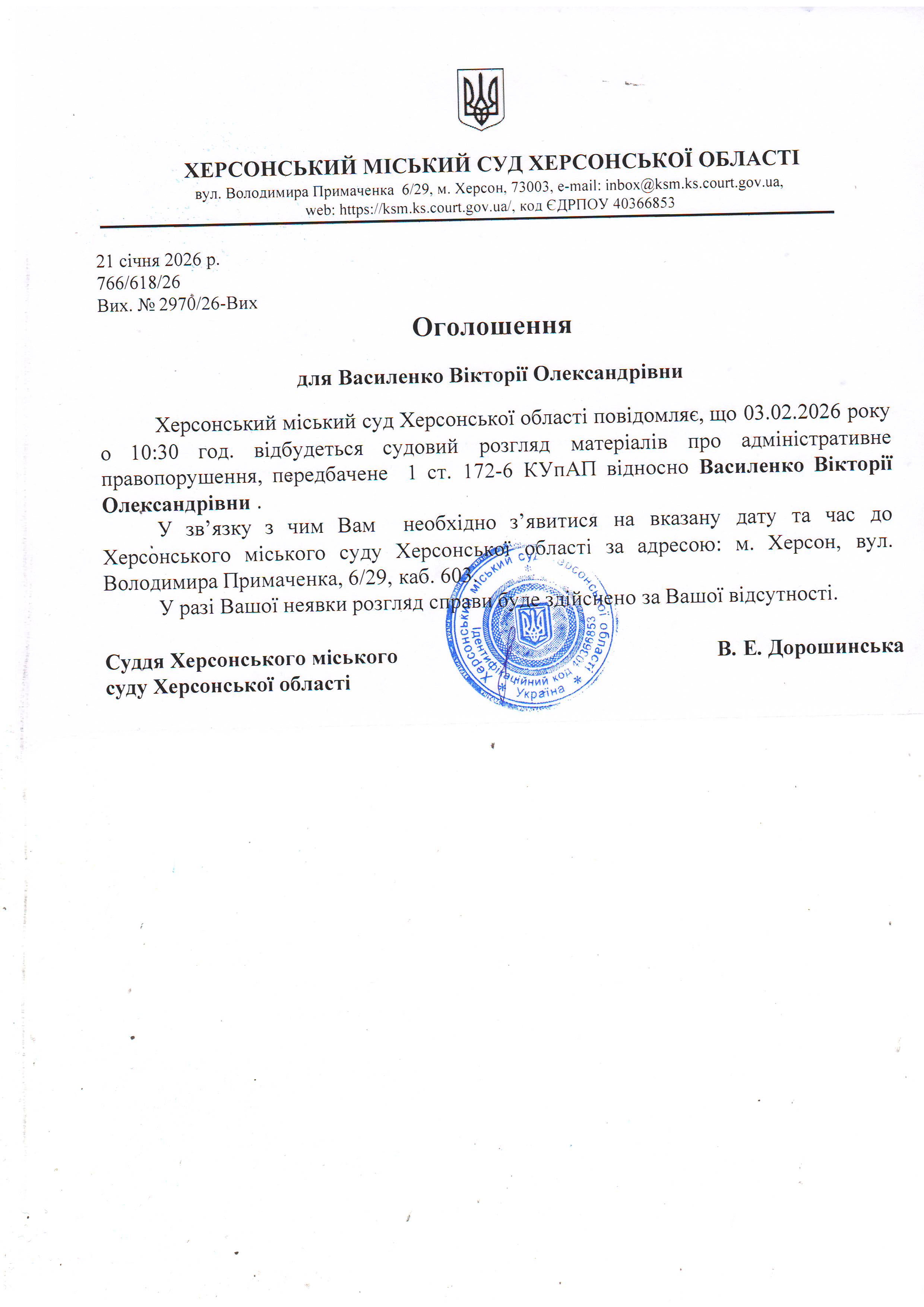 ОГОЛОШЕННЯ ПРО ВИКЛИК ДО СУДУ