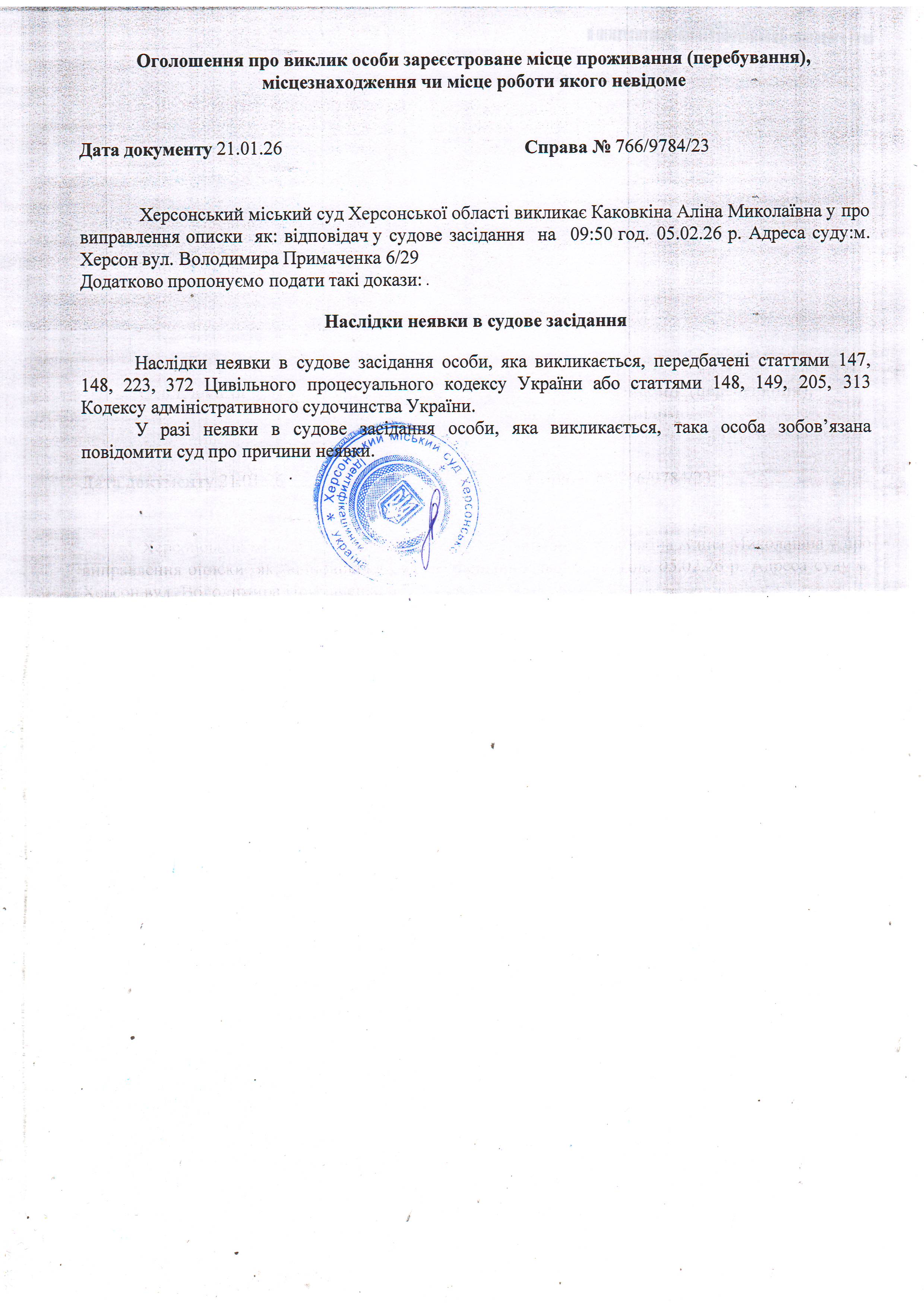 ОГОЛОШЕННЯ ПРО ВИКЛИК ДО СУДУ