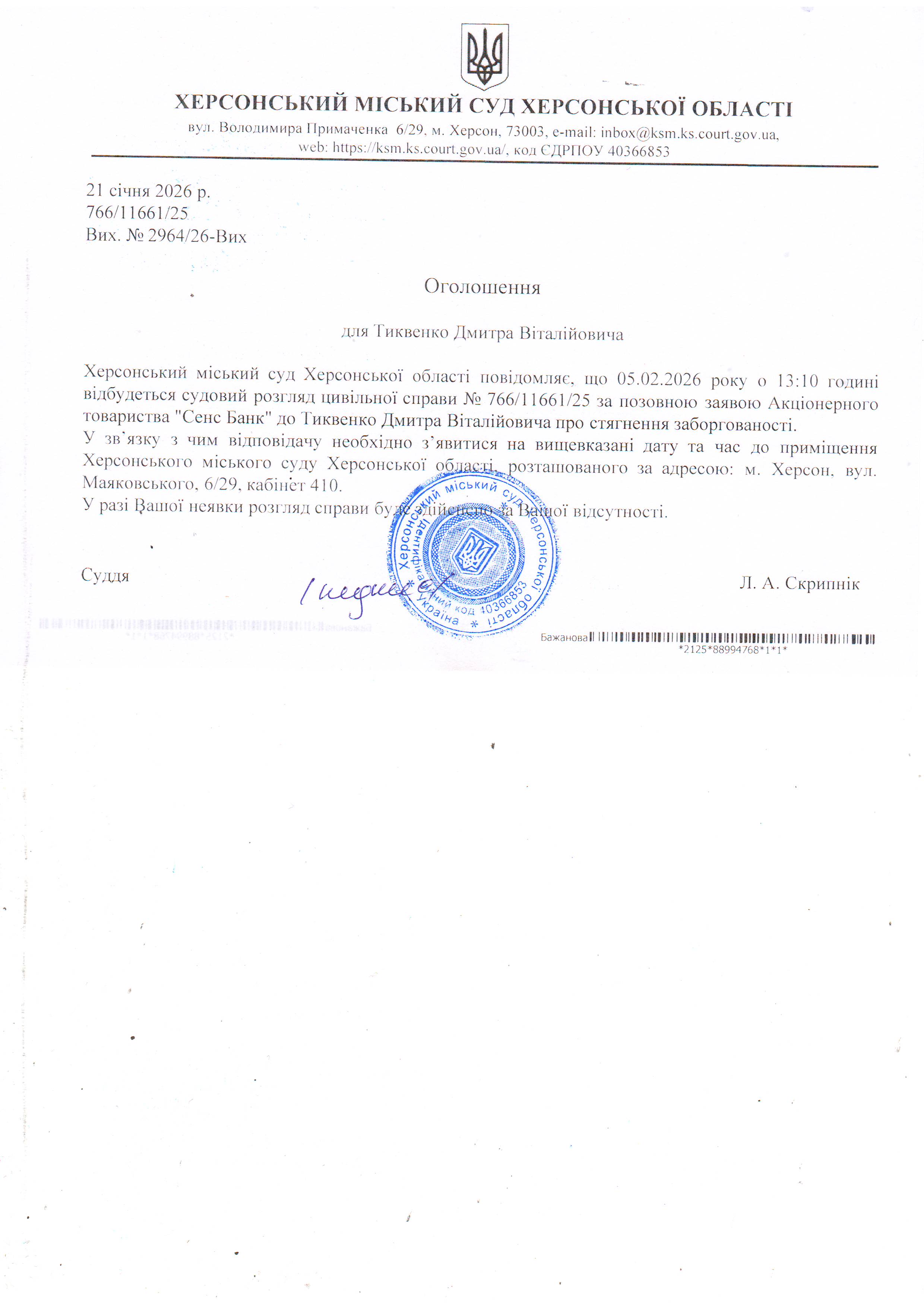 ОГОЛОШЕННЯ ПРО ВИКЛИК ДО СУДУ