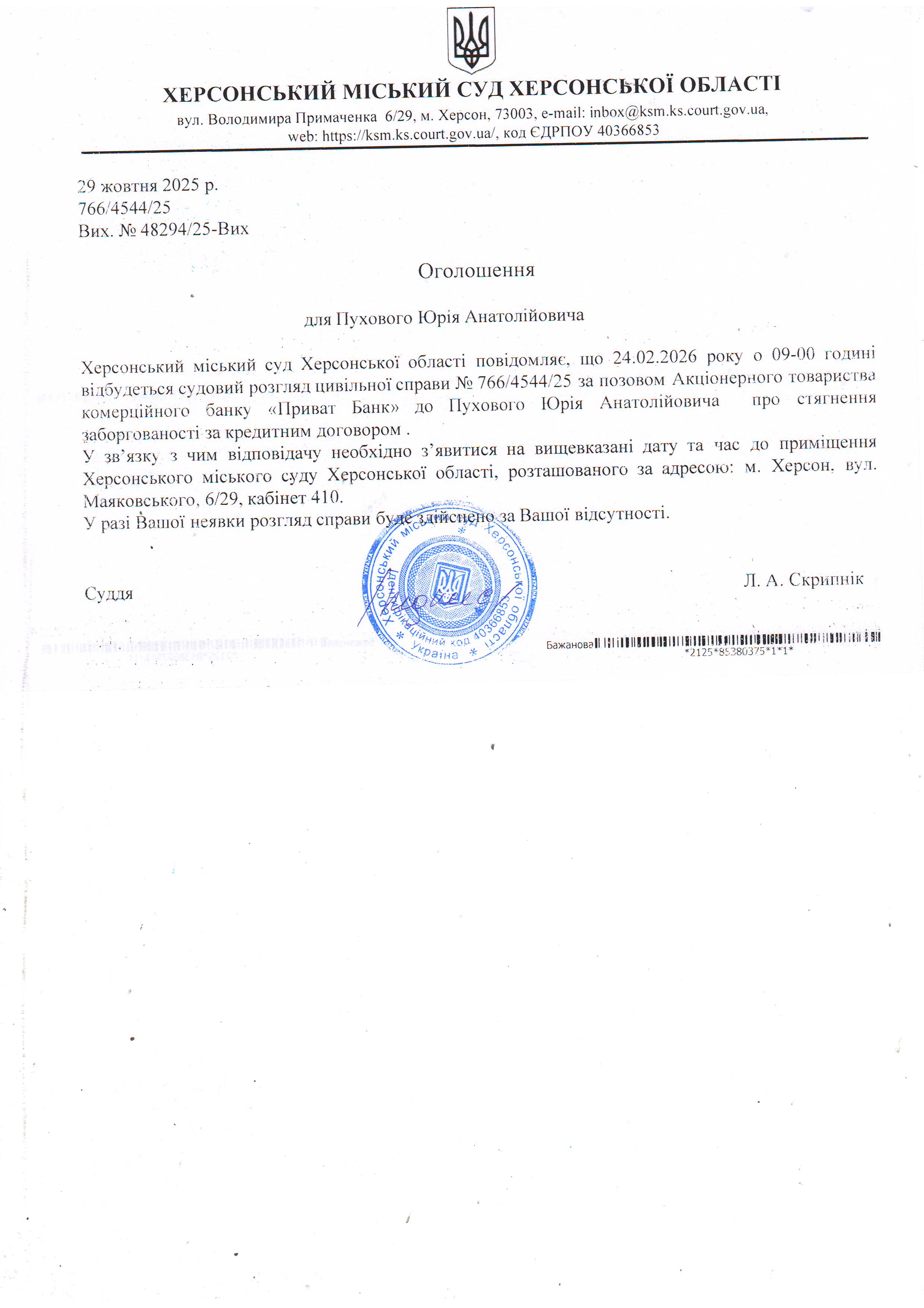 ОГОЛОШЕННЯ ПРО ВИКЛИК ДО СУДУ