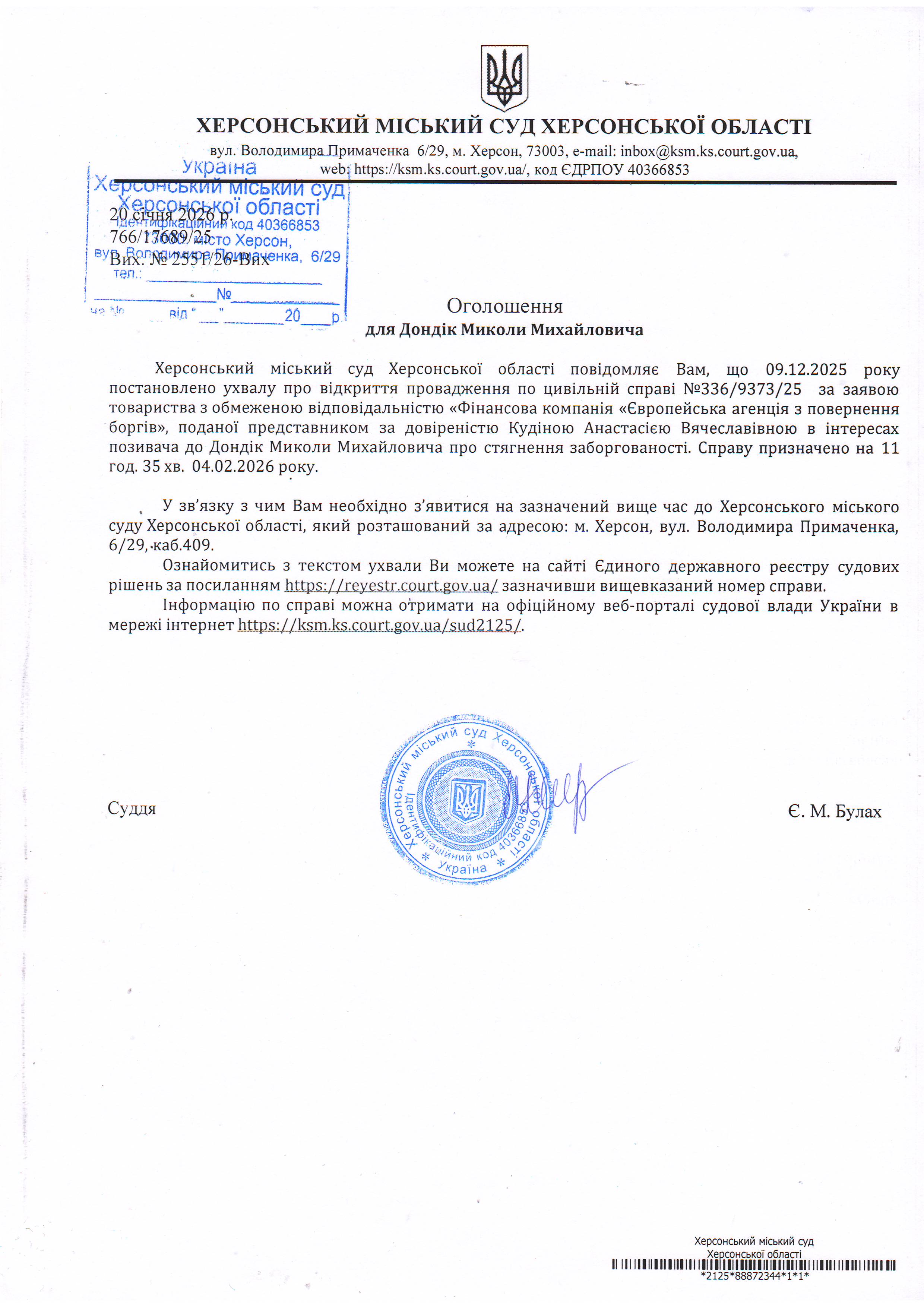 Оголошення про виклик особи в суд та повідомлення про судове рішення