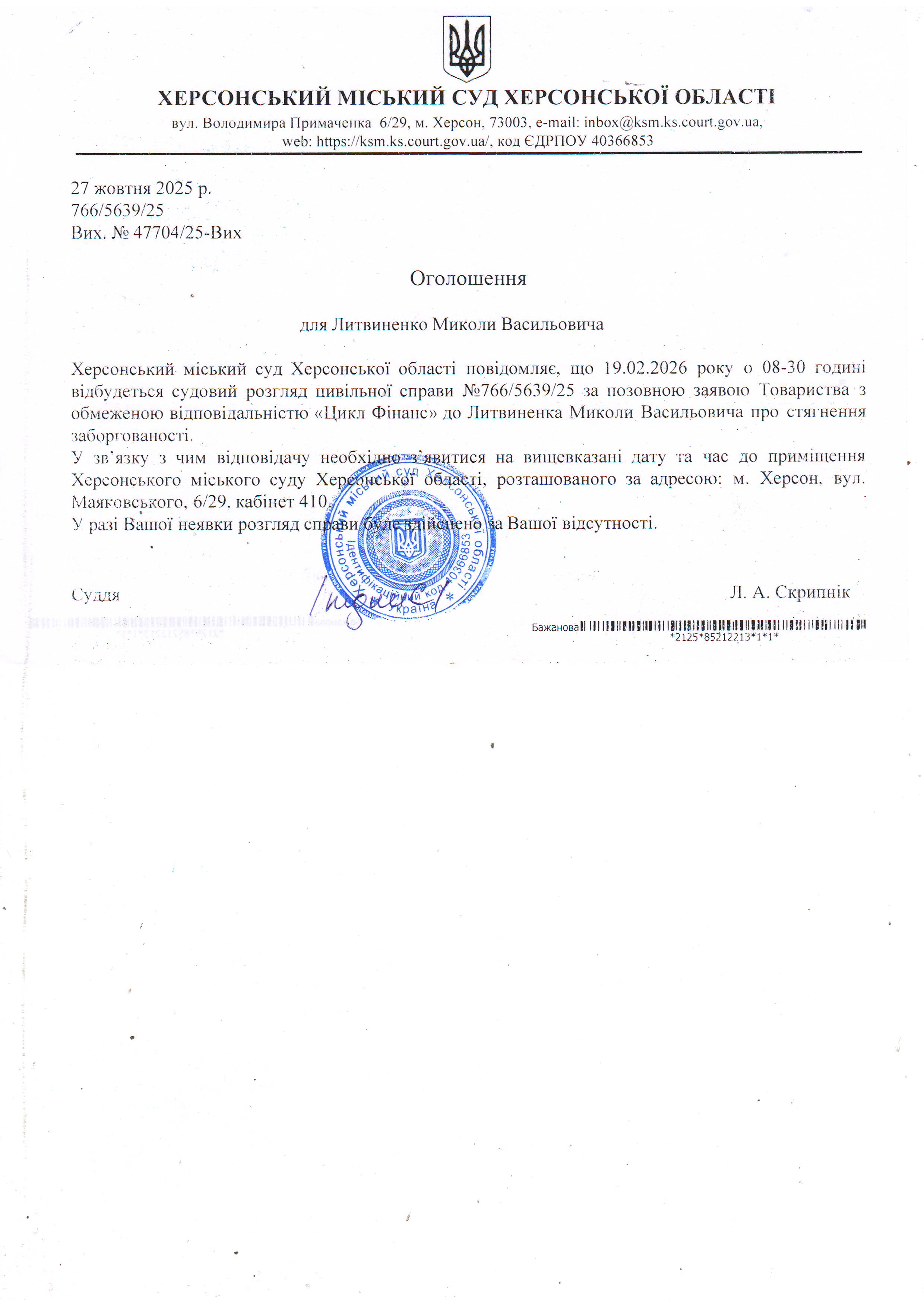 ОГОЛОШЕННЯ ПРО ВИКЛИК ДО СУДУ