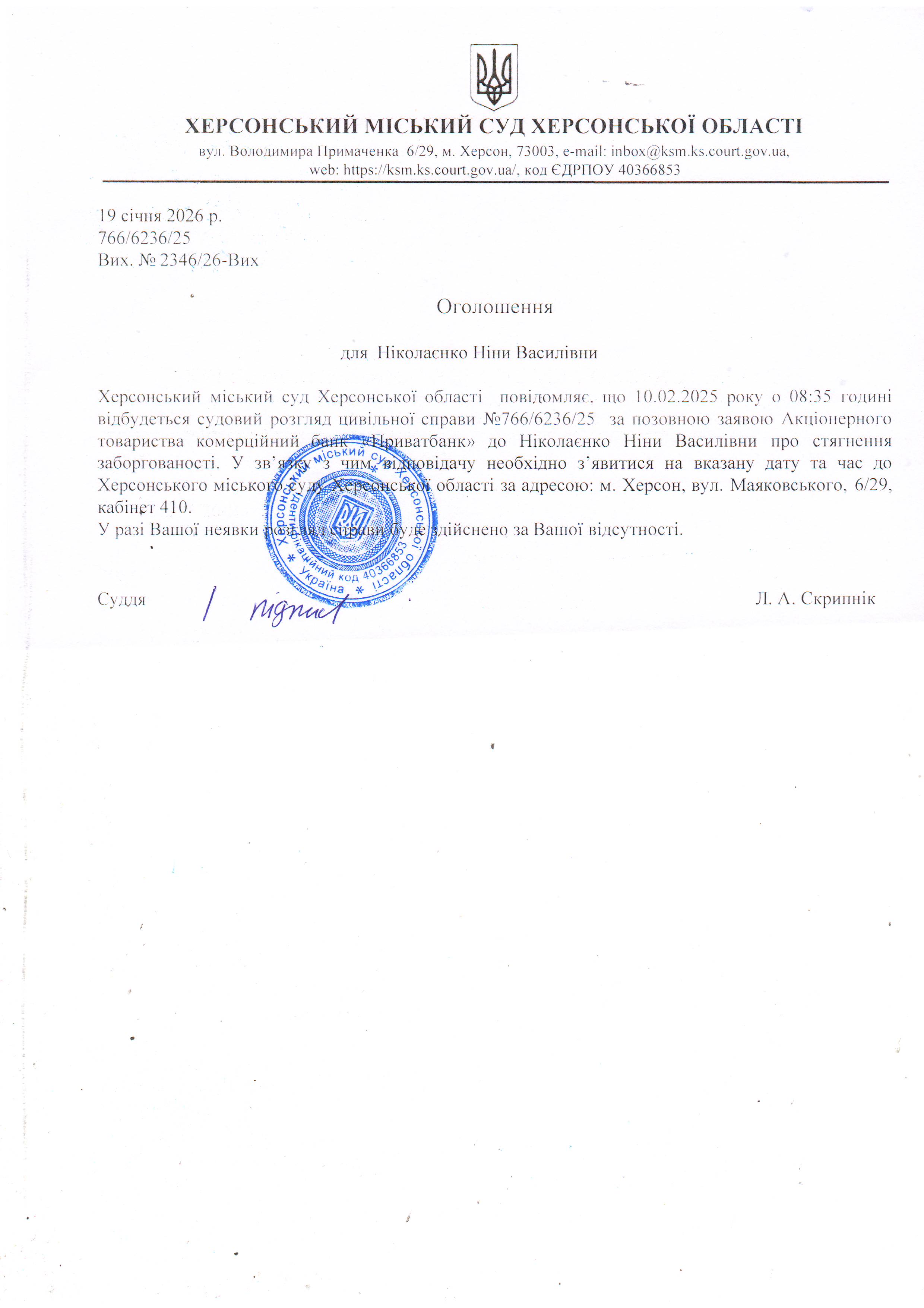 ОГОЛОШЕННЯ ПРО ВИКЛИК ДО СУДУ