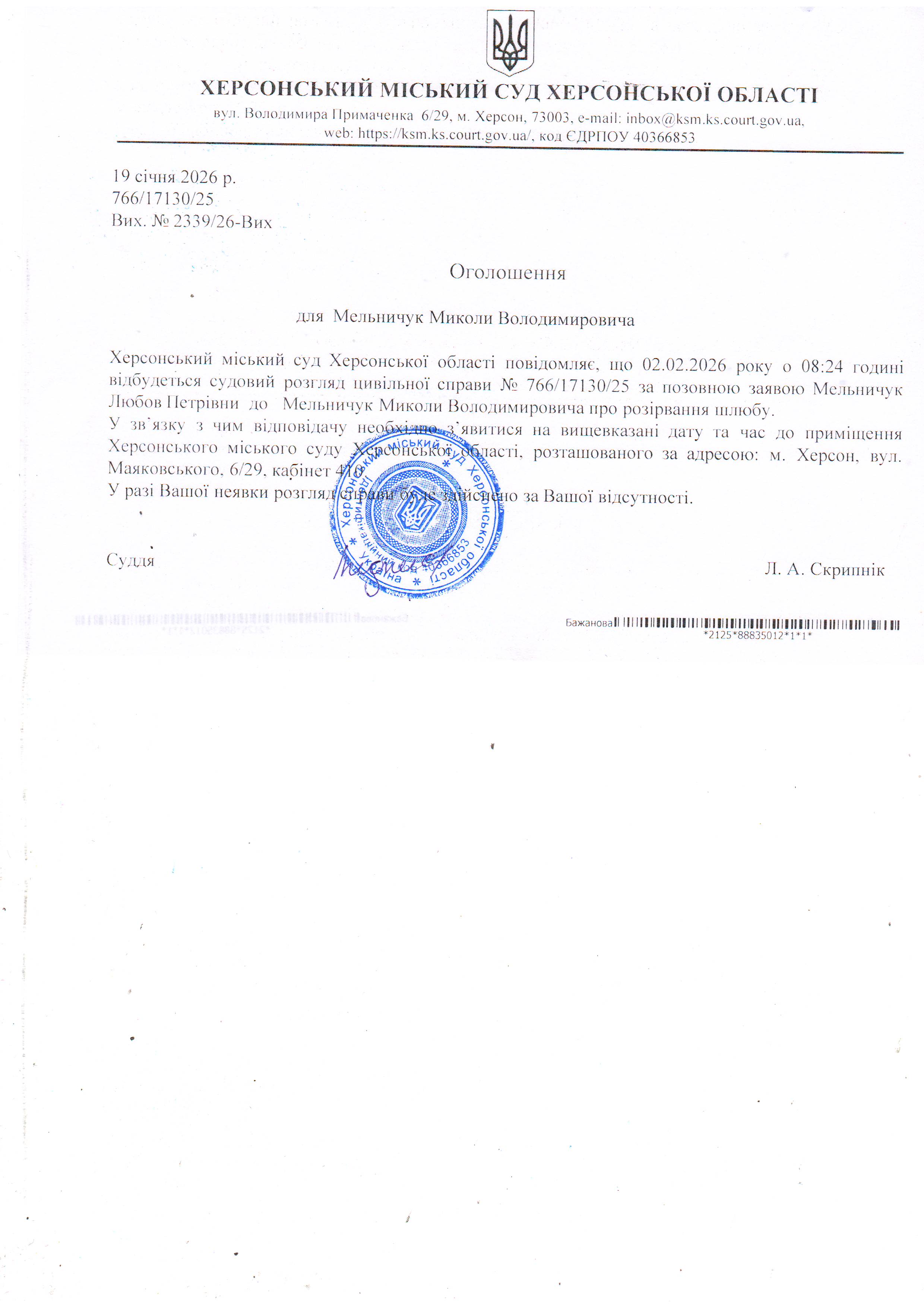 ОГОЛОШЕННЯ ПРО ВИКЛИК ДО СУДУ