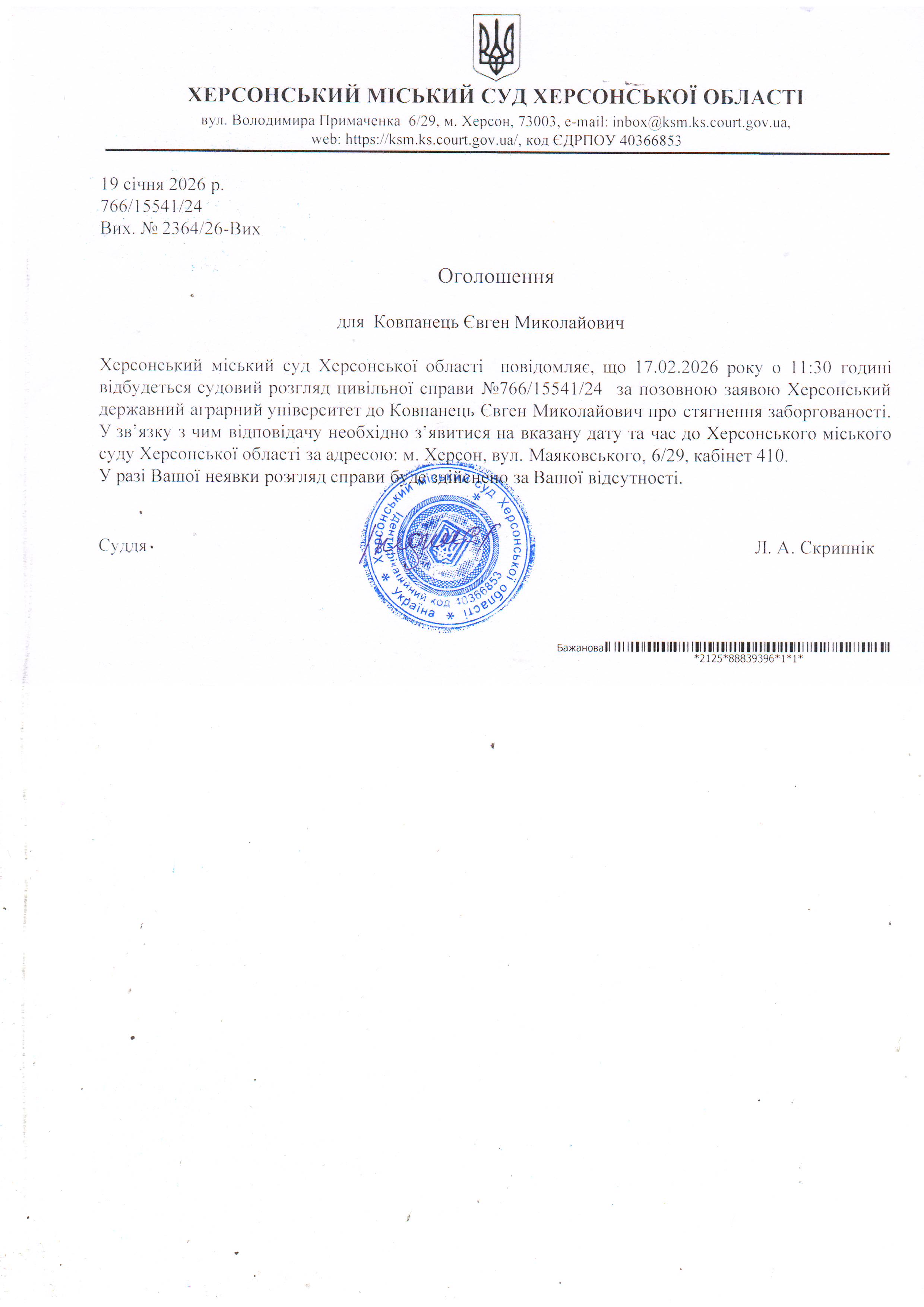 ОГОЛОШЕННЯ ПРО ВИКЛИК ДО СУДУ