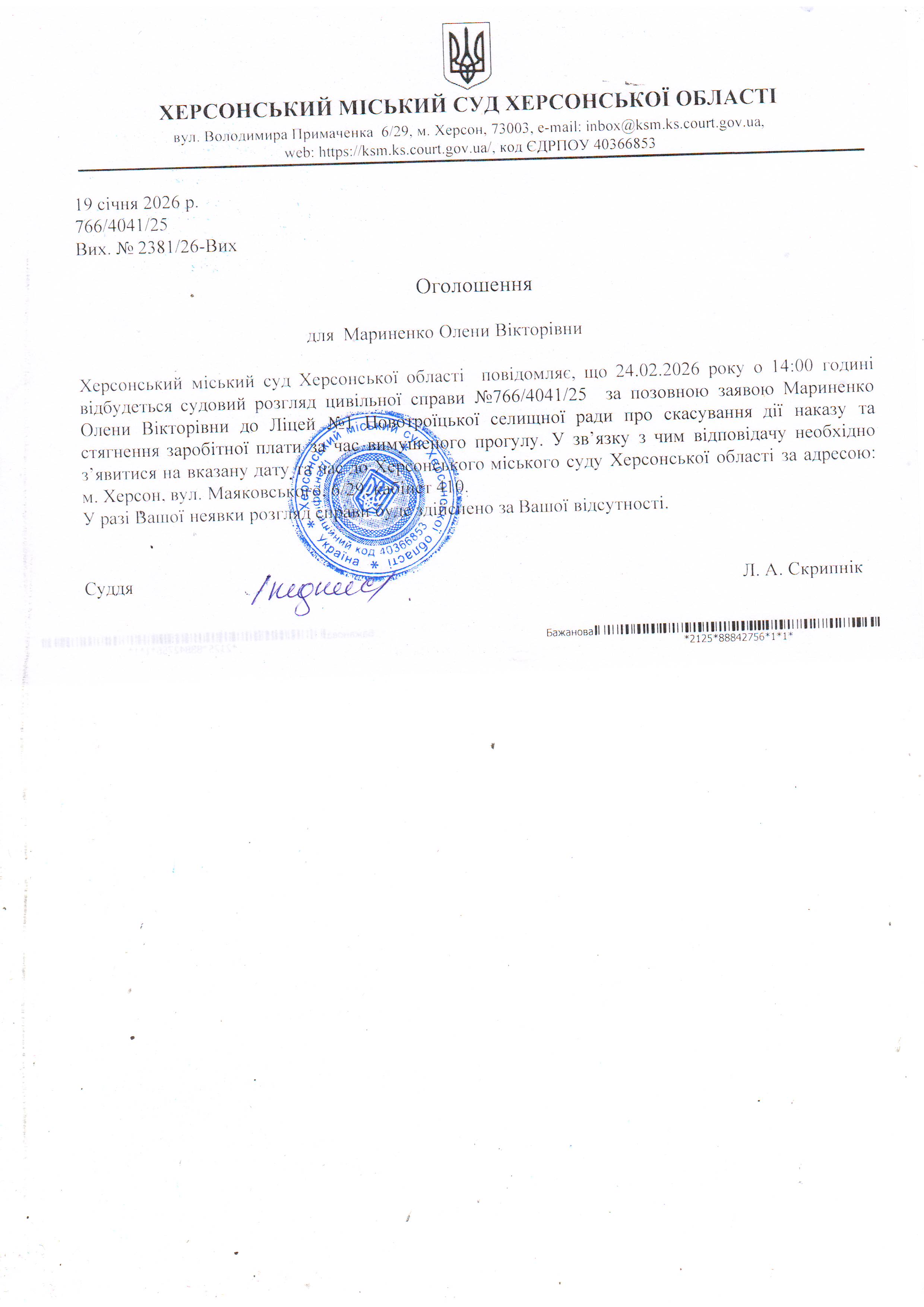 Оголошення про виклик особи в суд та повідомлення про судове рішення