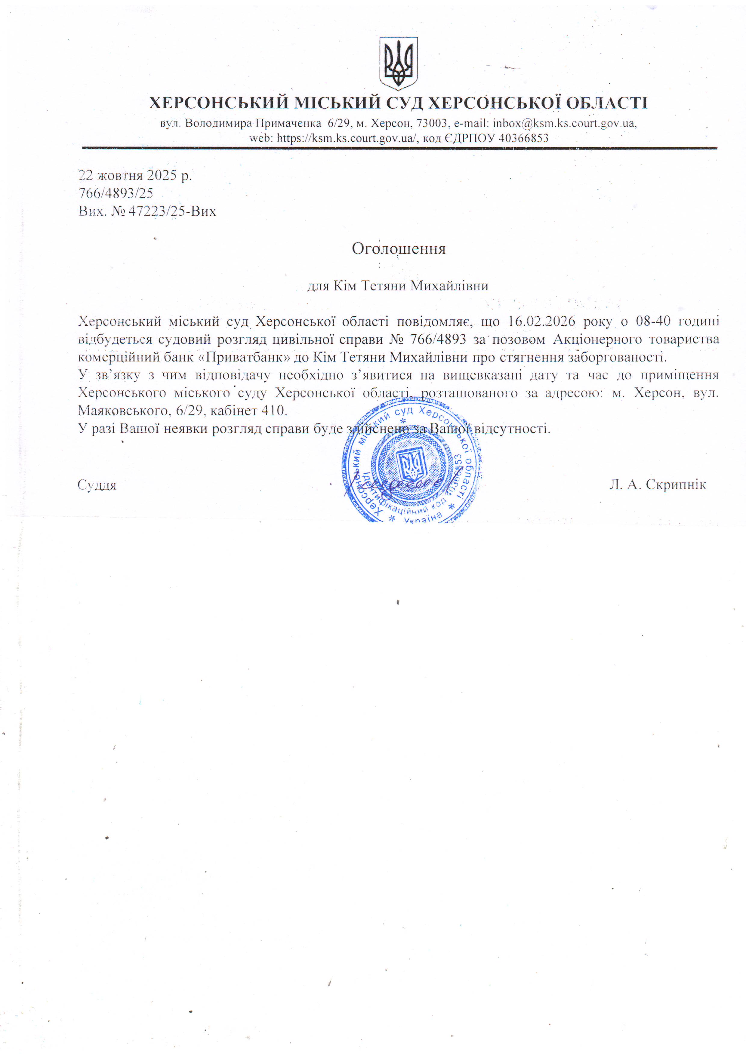 ОГОЛОШЕННЯ ПРО ВИКЛИК ДО СУДУ