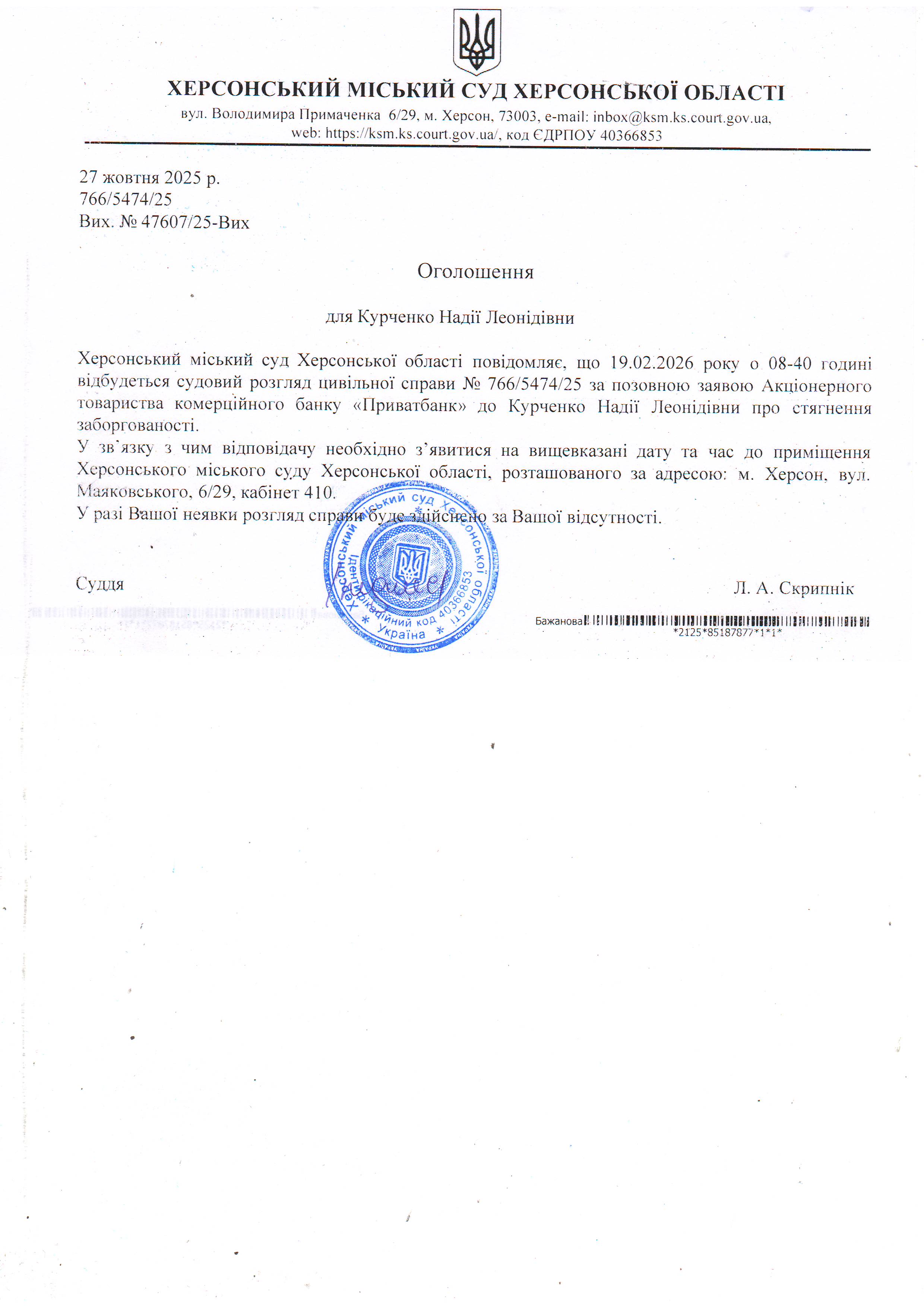 ОГОЛОШЕННЯ ПРО ВИКЛИК ДО СУДУ