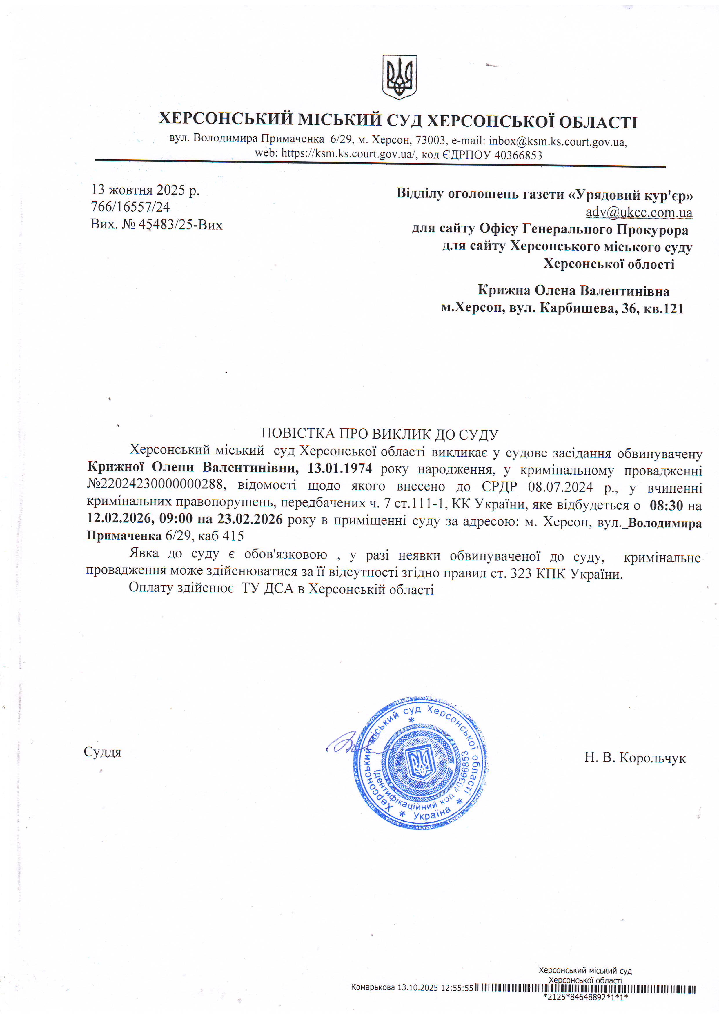 ОГОЛОШЕННЯ ПРО ВИКЛИК ДО СУДУ