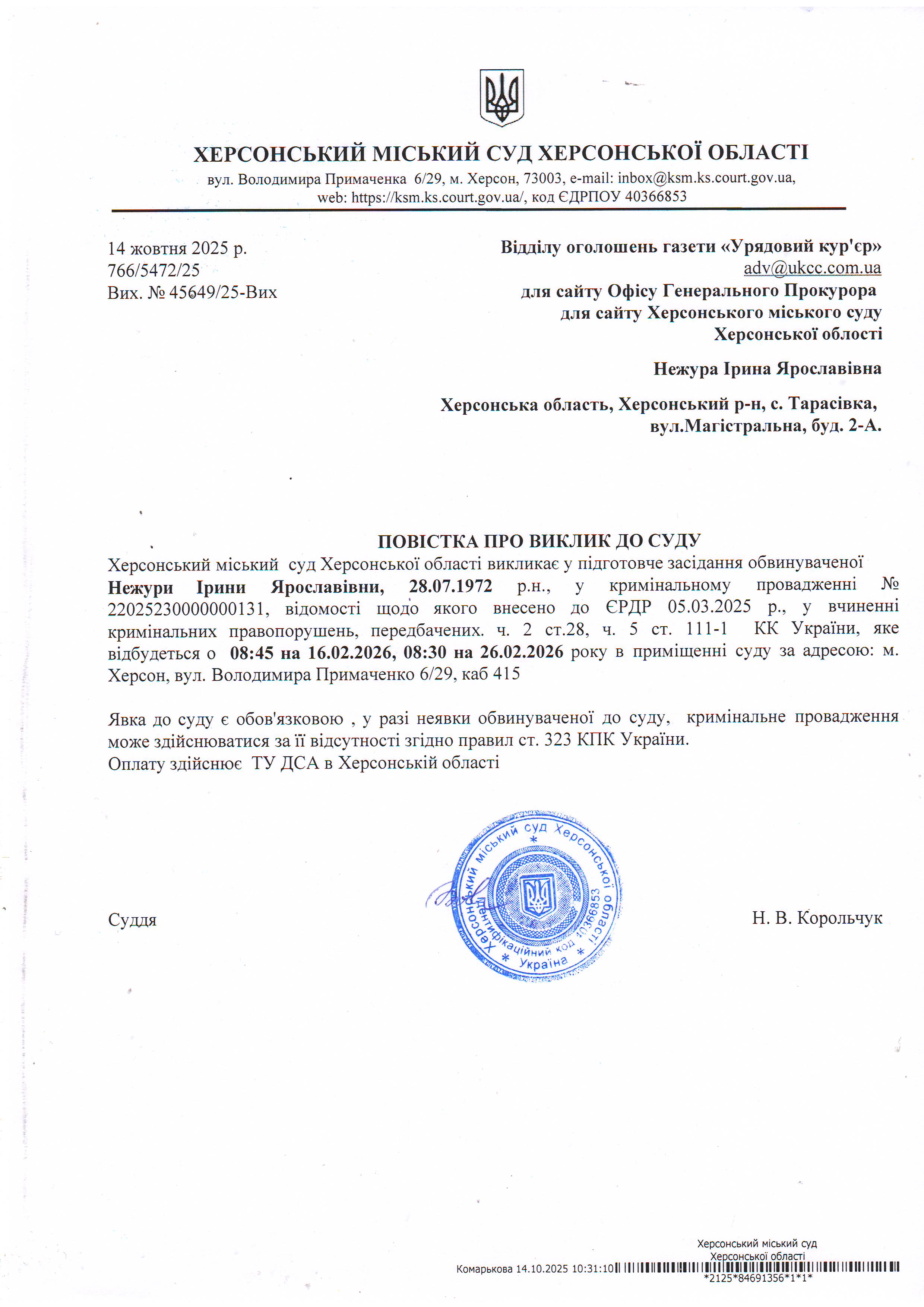ОГОЛОШЕННЯ ПРО ВИКЛИК ДО СУДУ