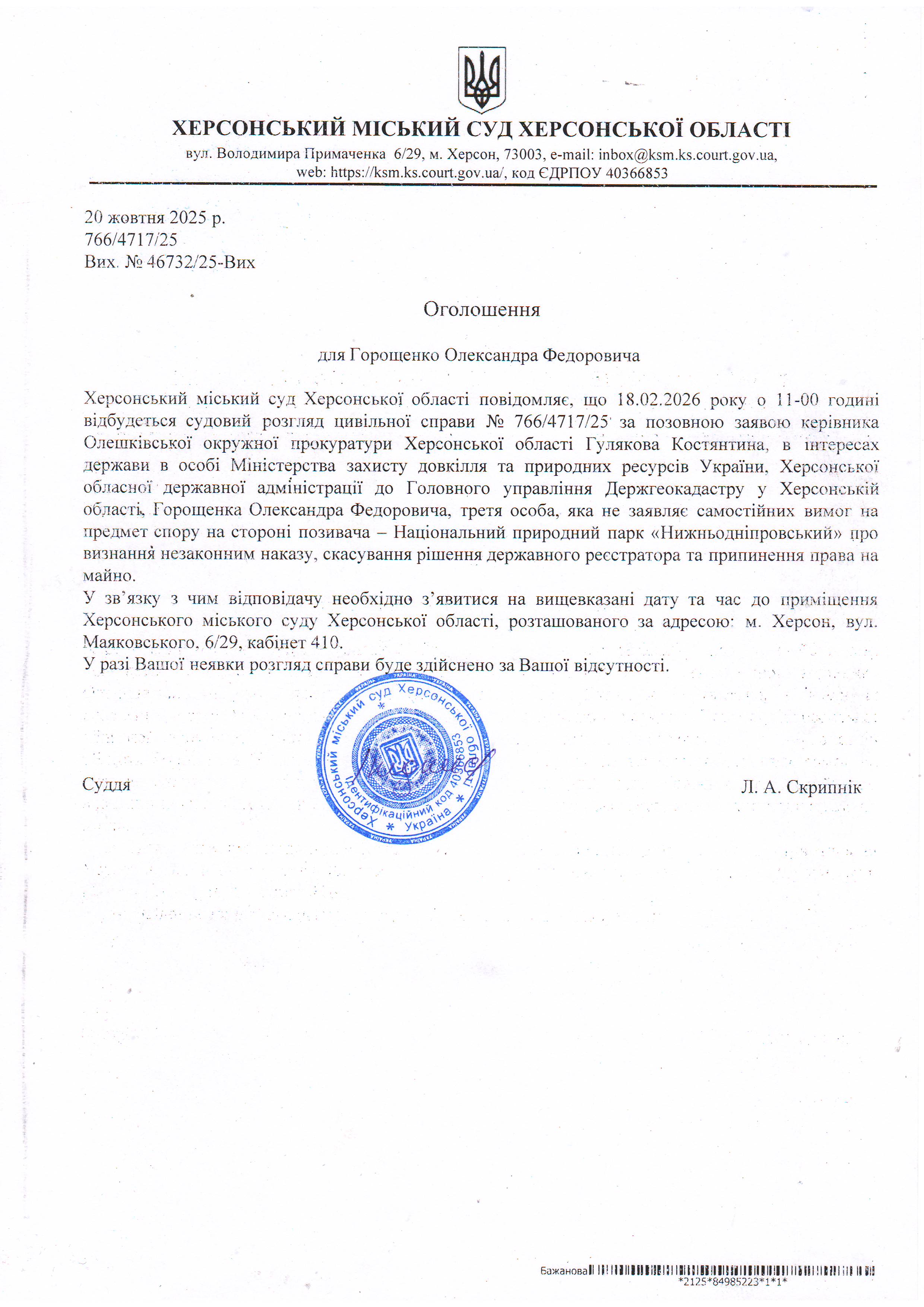 ОГОЛОШЕННЯ ПРО ВИКЛИК ДО СУДУ
