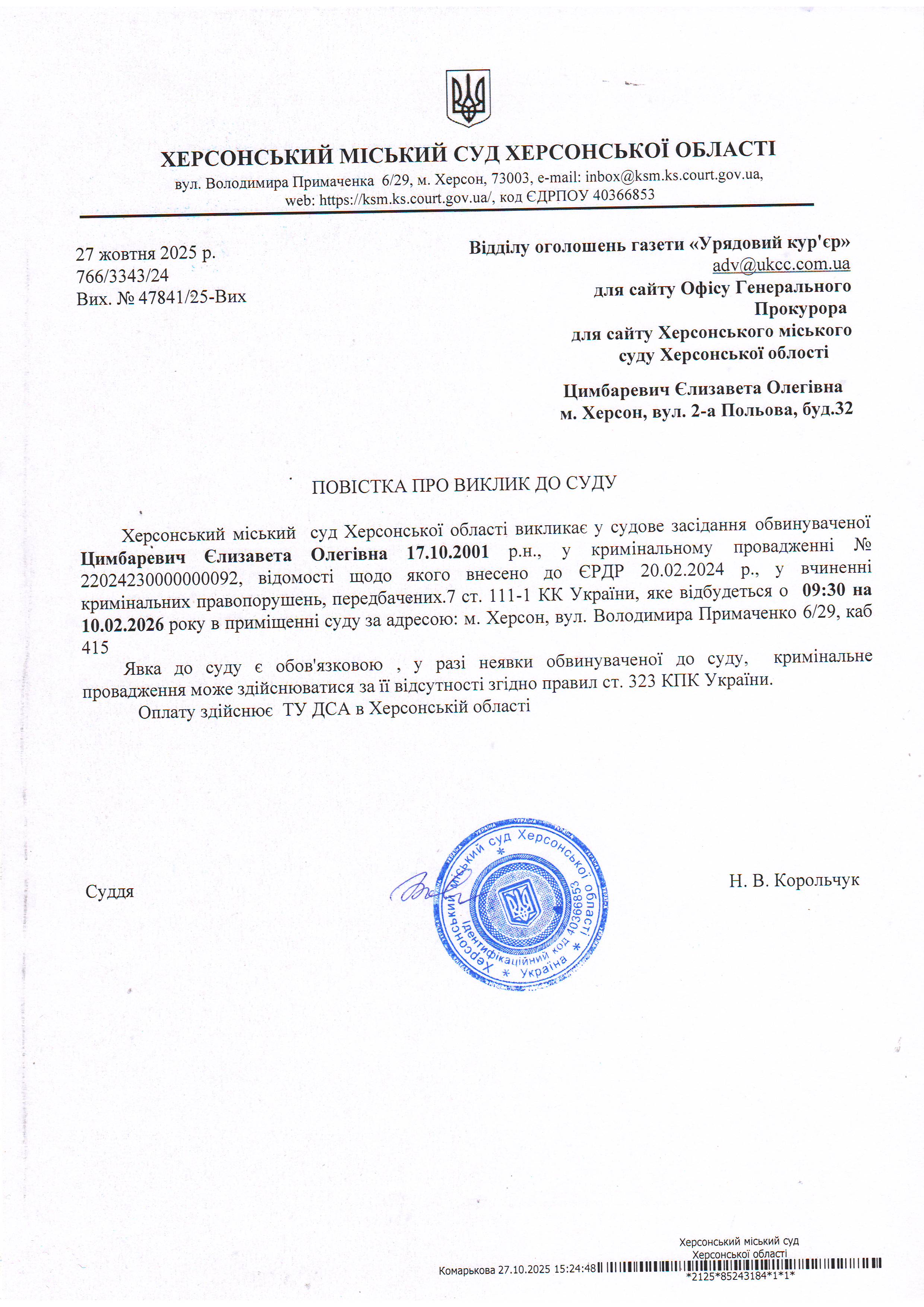 Оголошення для Цимбаревич Єлизавети Олегівни
