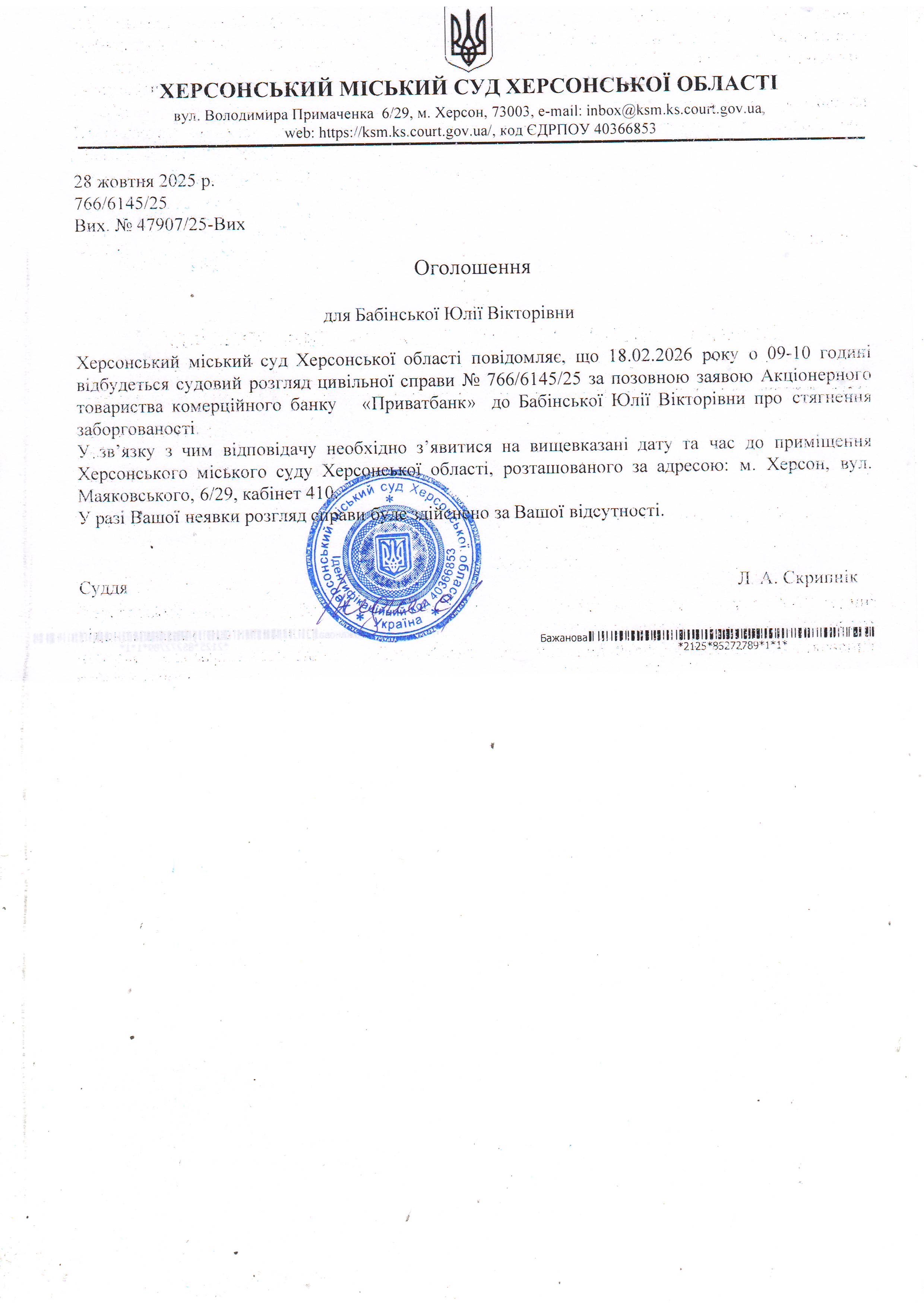 ОГОЛОШЕННЯ ПРО ВИКЛИК ДО СУДУ
