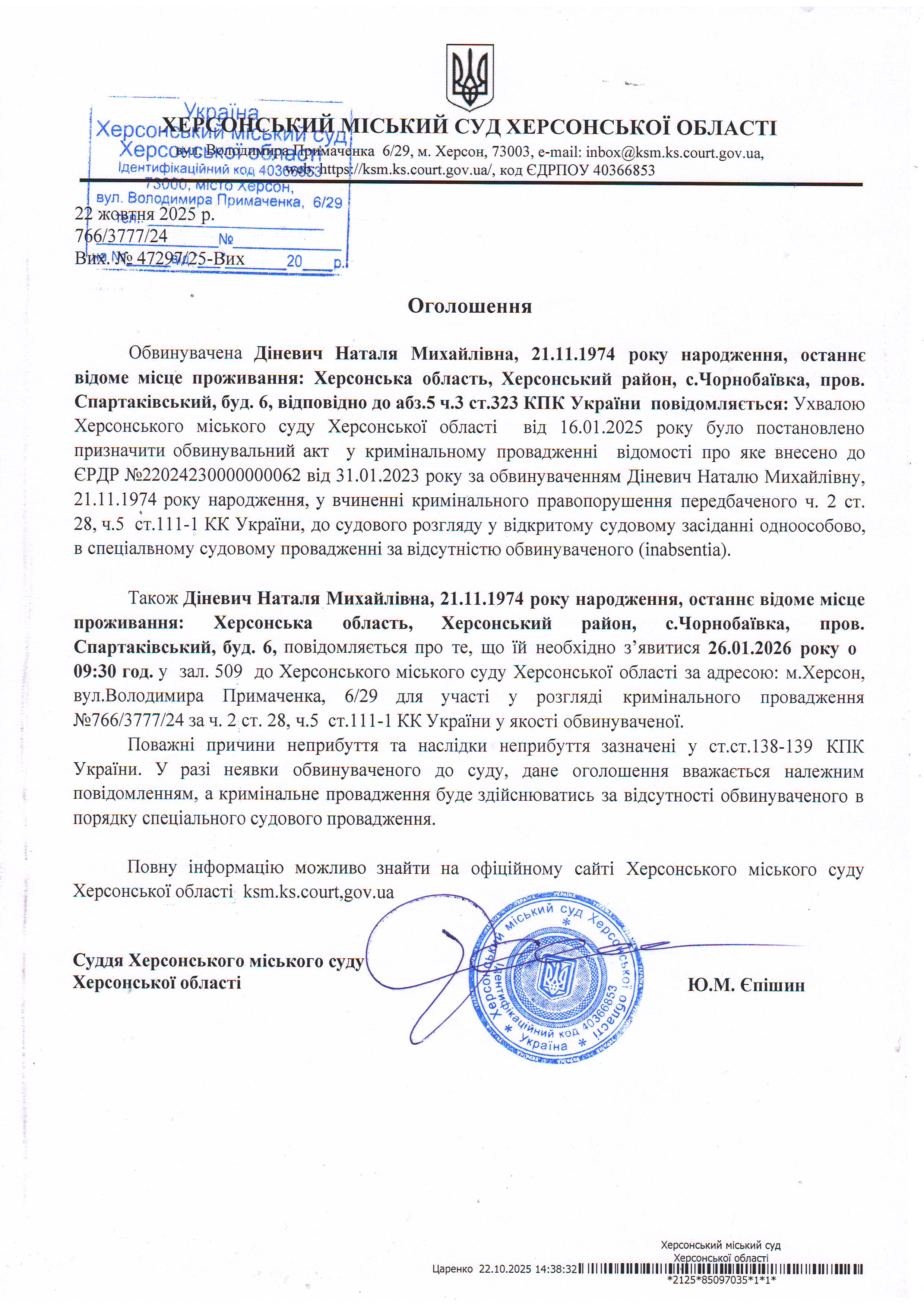 Оголошення про виклик особи в суд та повідомлення про судове рішення