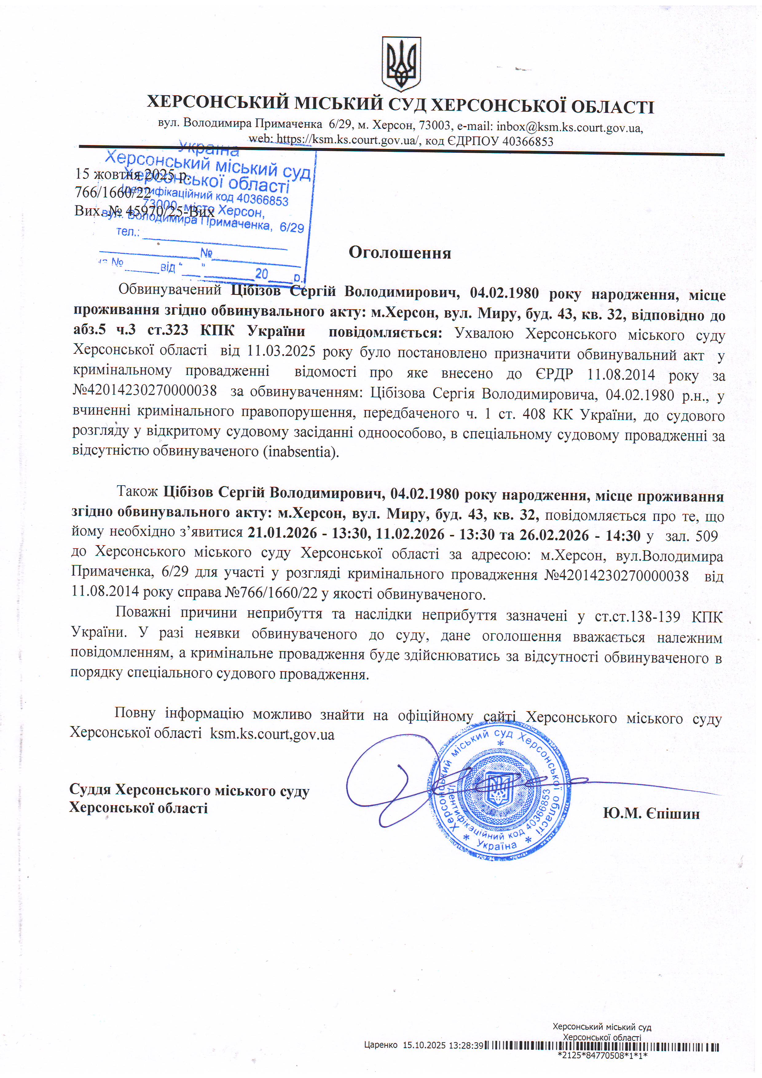 ОГОЛОШЕННЯ ПРО ВИКЛИК ДО СУДУ
