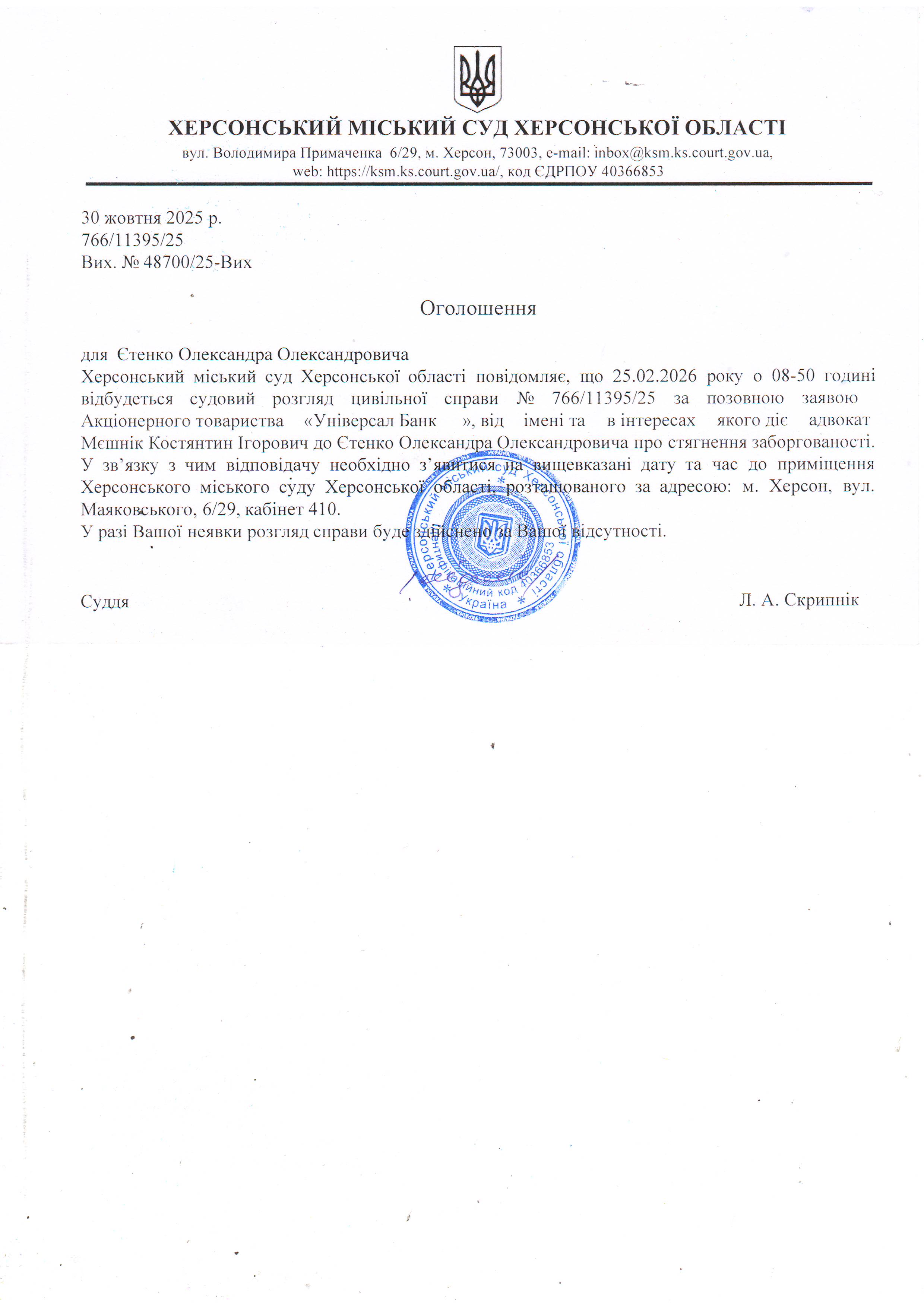 ОГОЛОШЕННЯ ПРО ВИКЛИК ДО СУДУ
