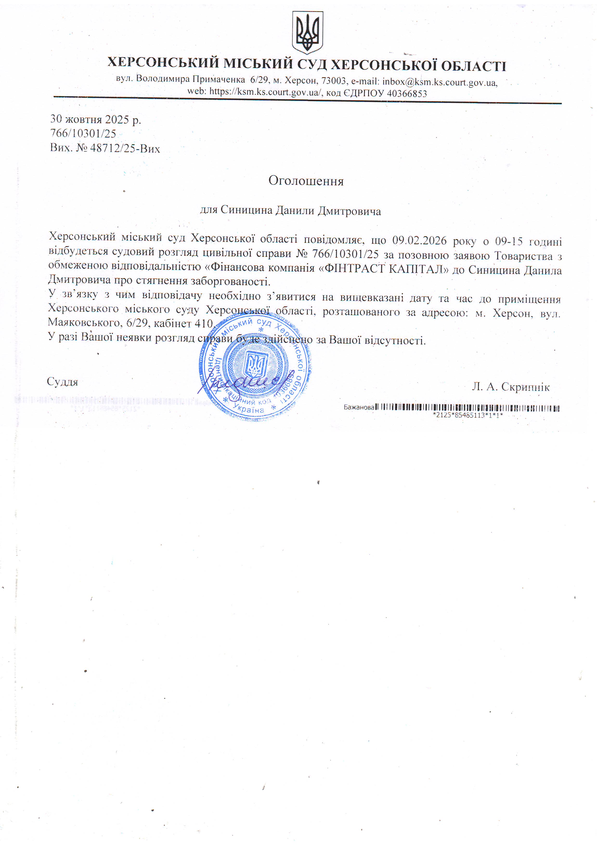 ОГОЛОШЕННЯ ПРО ВИКЛИК ДО СУДУ