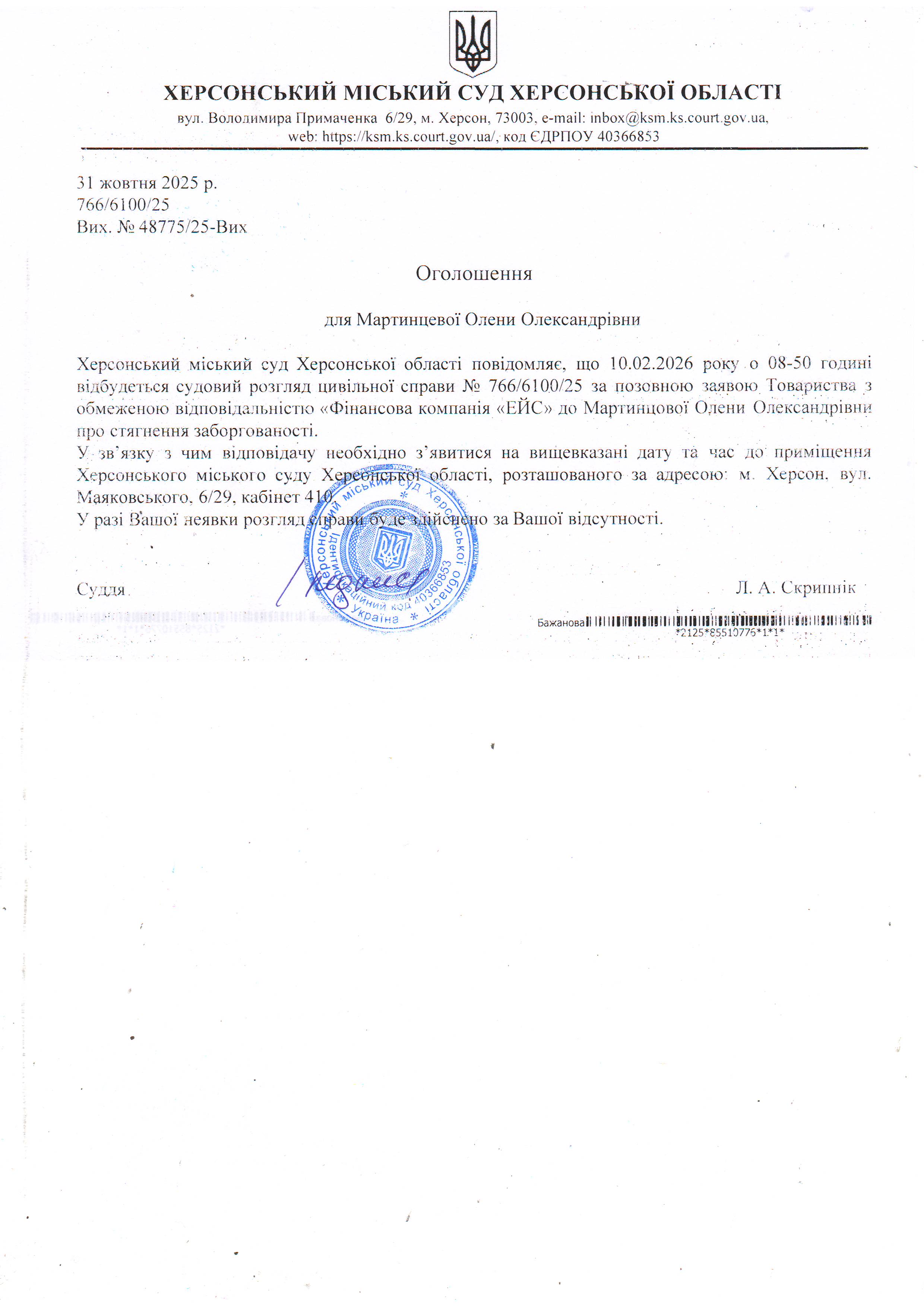 ОГОЛОШЕННЯ ПРО ВИКЛИК ДО СУДУ