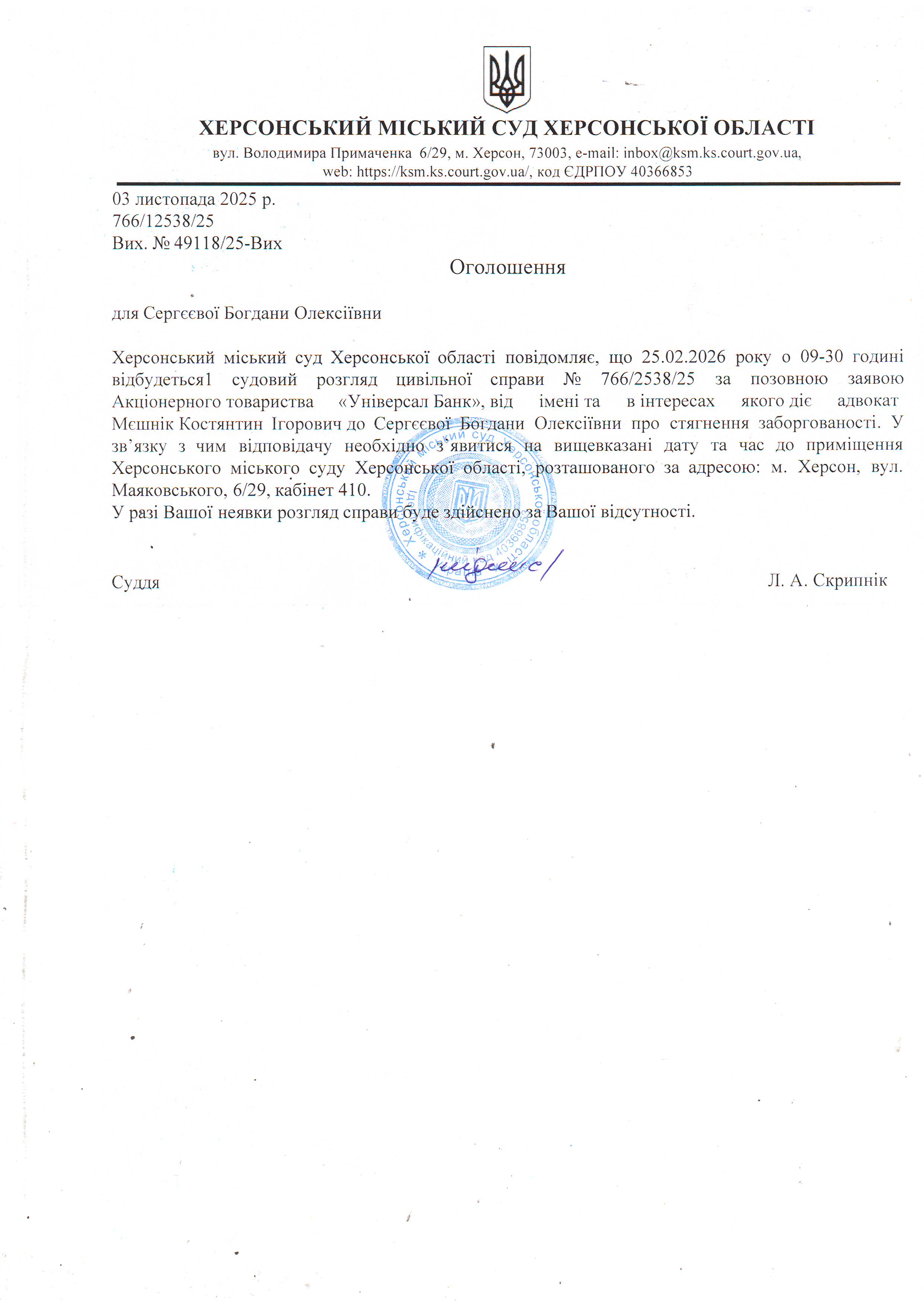 ОГОЛОШЕННЯ ПРО ВИКЛИК ДО СУДУ