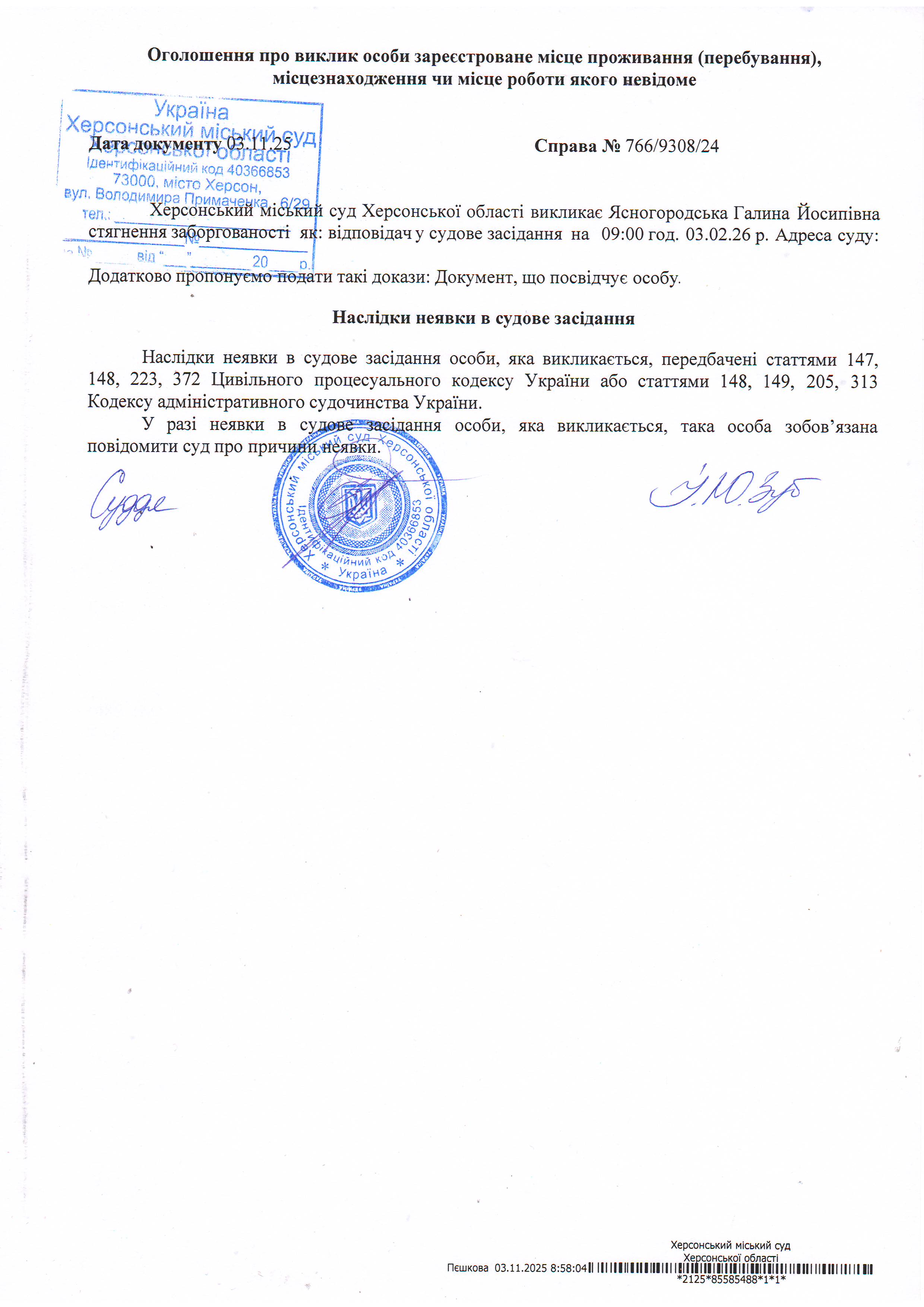 ОГОЛОШЕННЯ ПРО ВИКЛИК ДО СУДУ