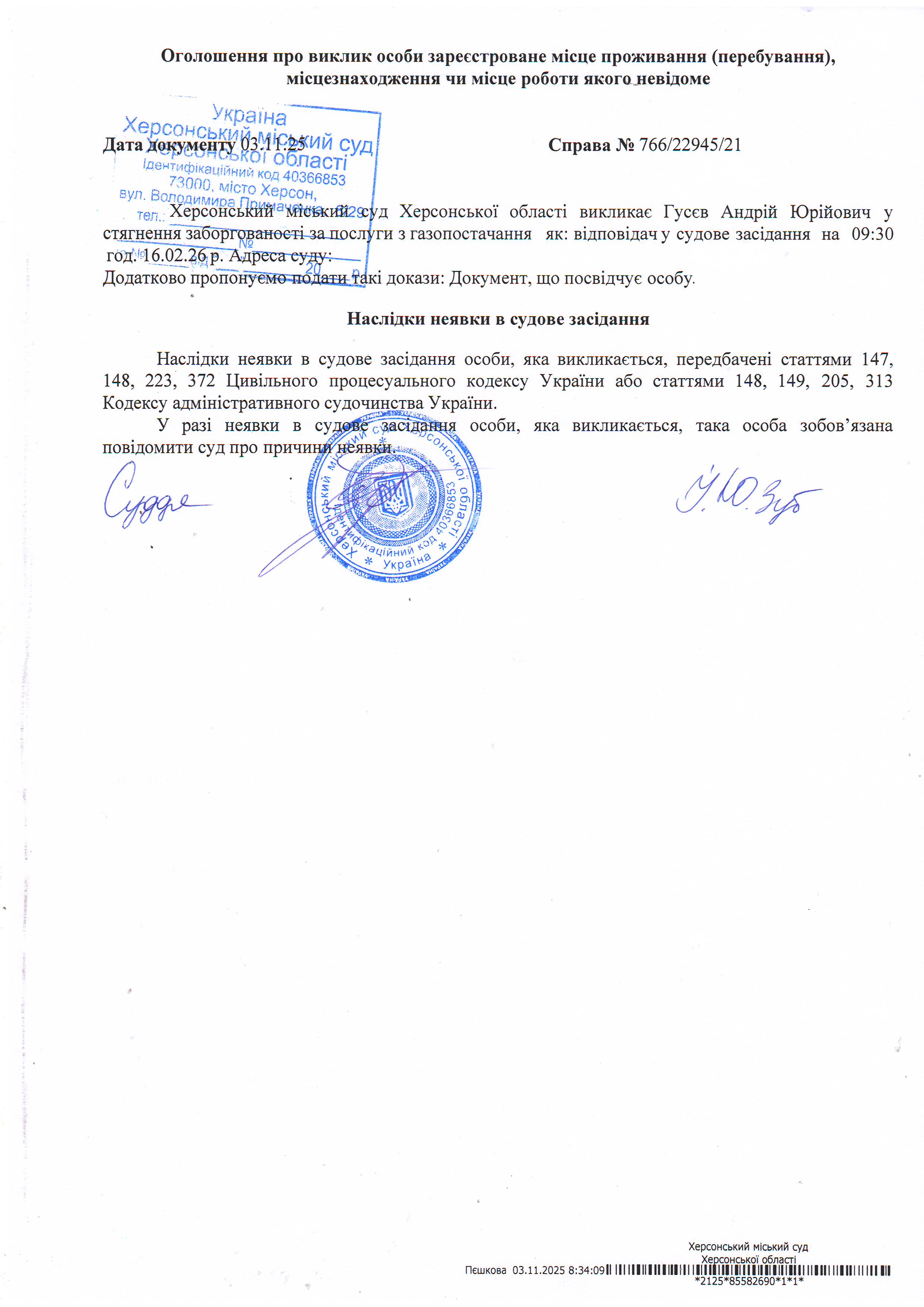 ОГОЛОШЕННЯ ПРО ВИКЛИК ДО СУДУ