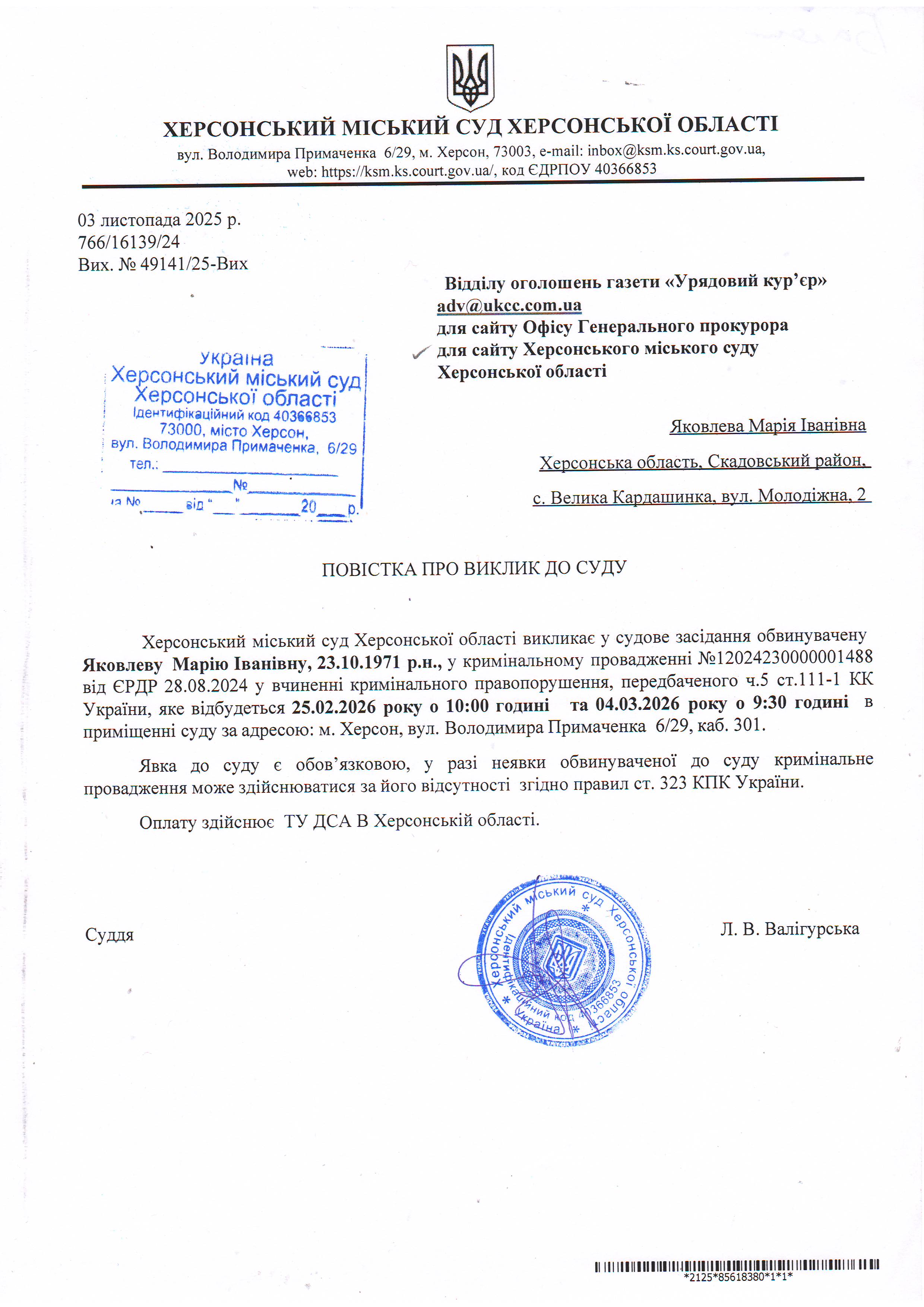 ОГОЛОШЕННЯ ПРО ВИКЛИК ДО СУДУ