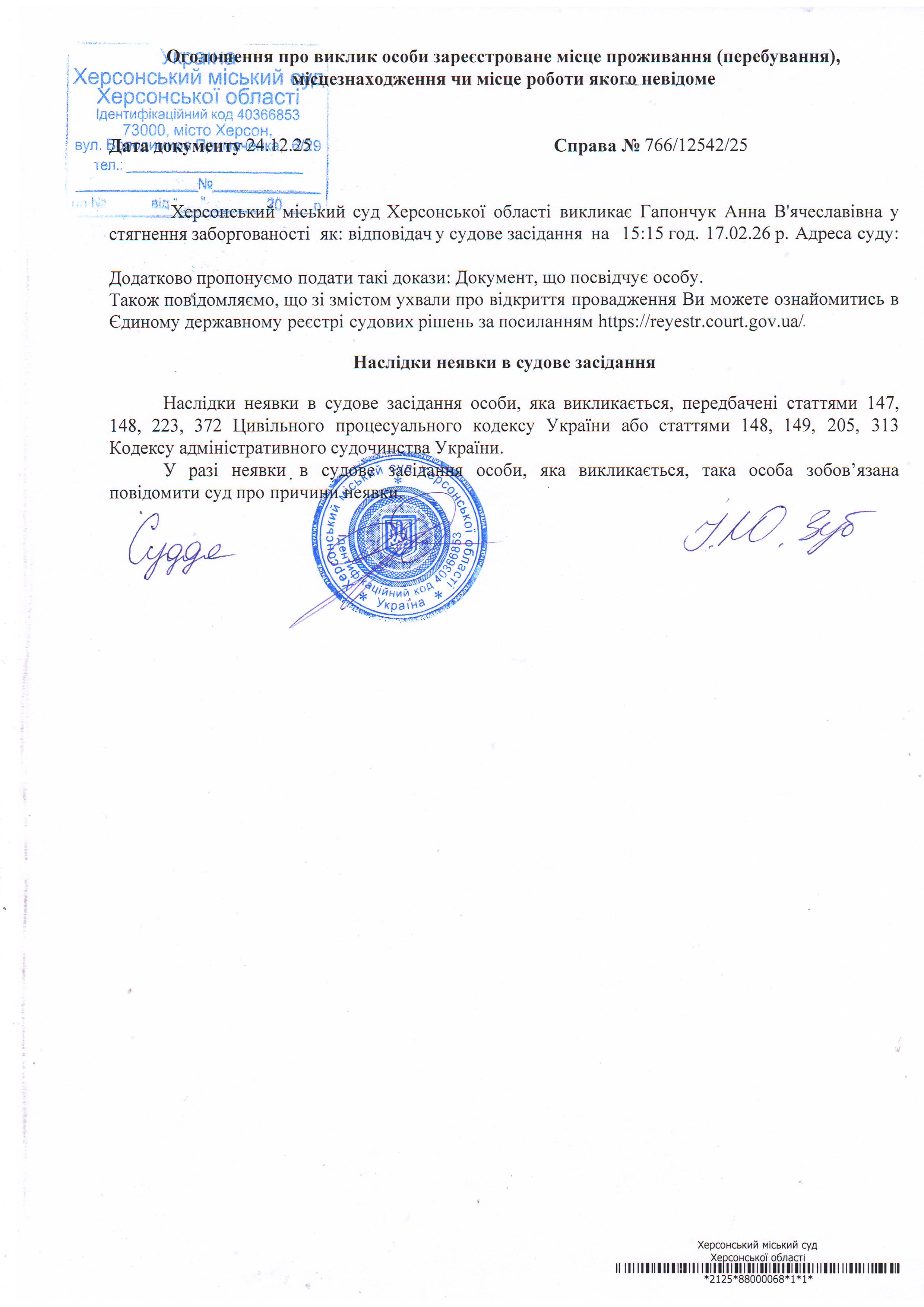 Оголошення про виклик особи в суд та повідомлення про судове рішення