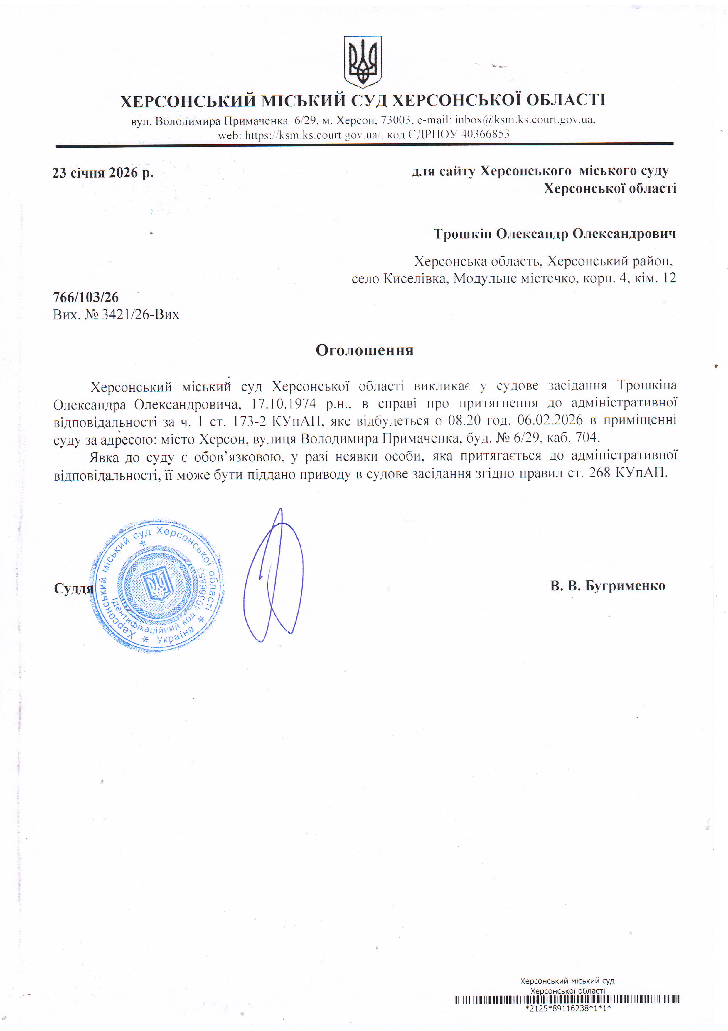 ОГОЛОШЕННЯ ПРО ВИКЛИК ДО СУДУ
