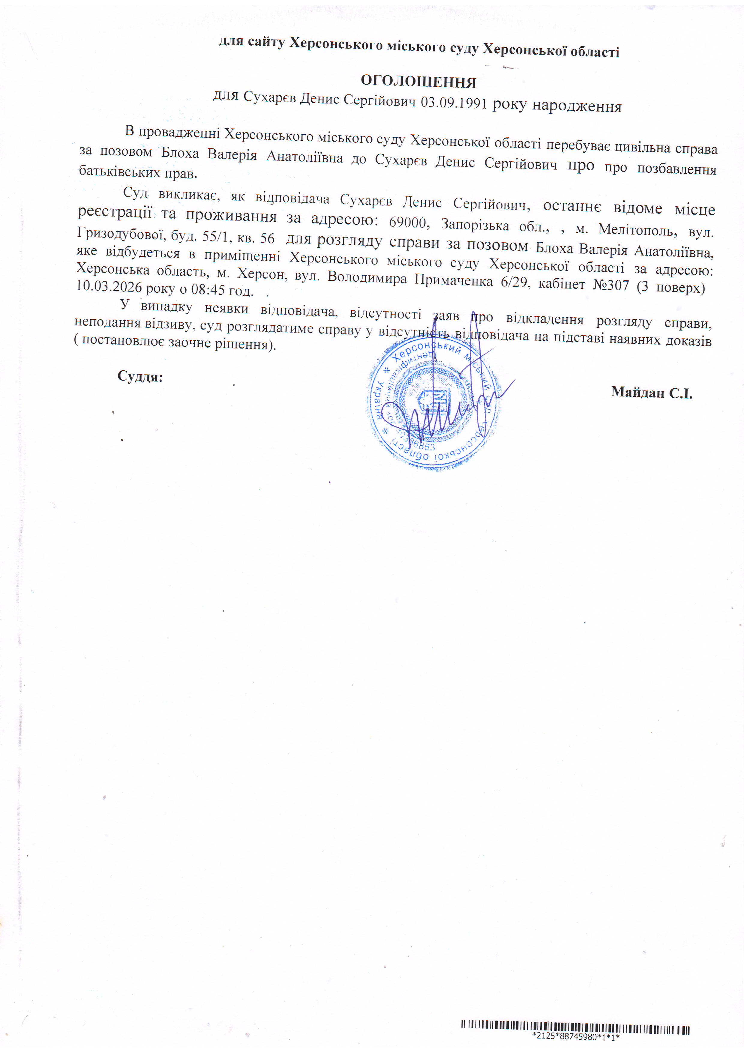 Оголошення для Сухарєва Дениса Сергійовича
