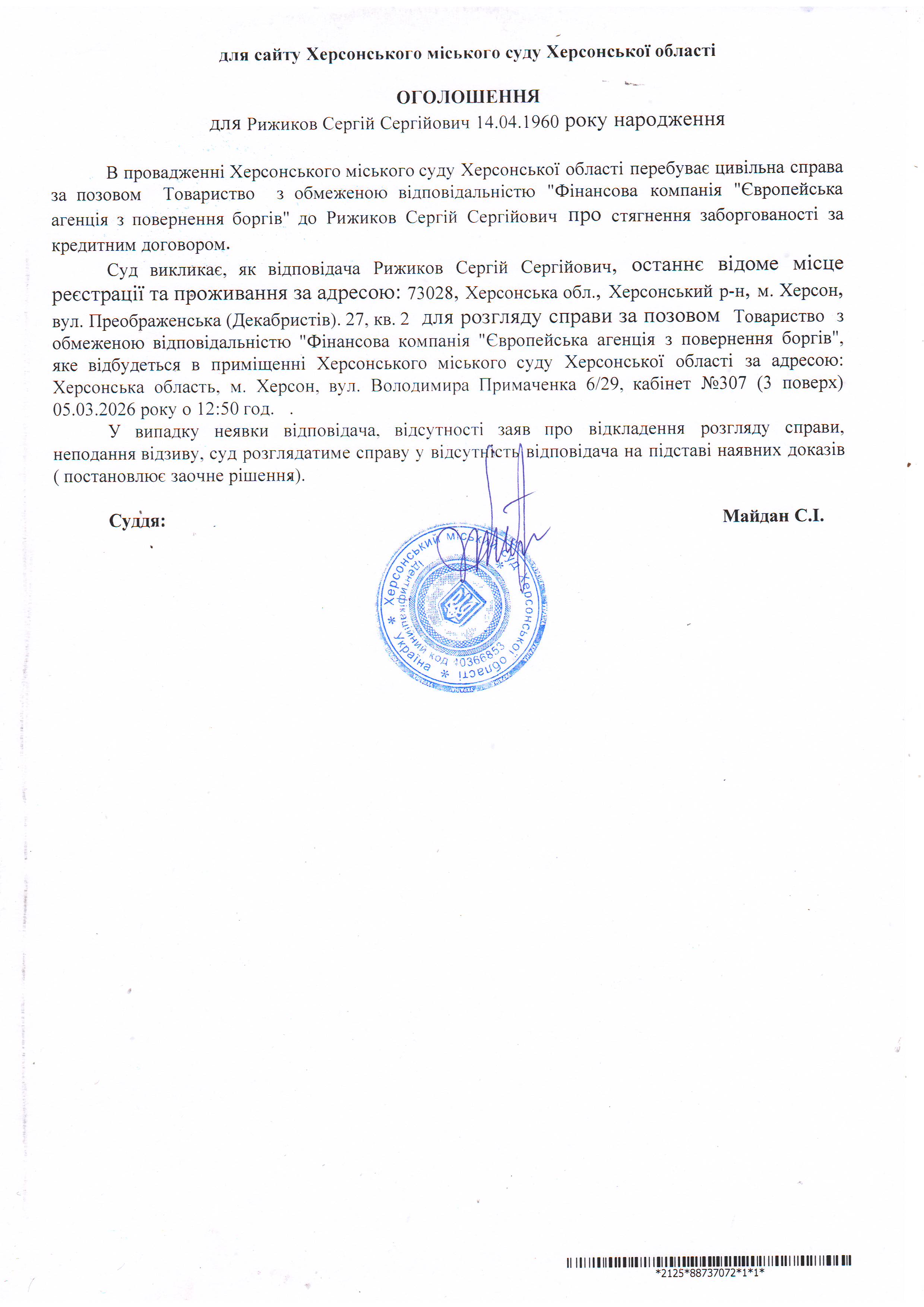 Оголошення про виклик особи в суд та повідомлення про судове рішення