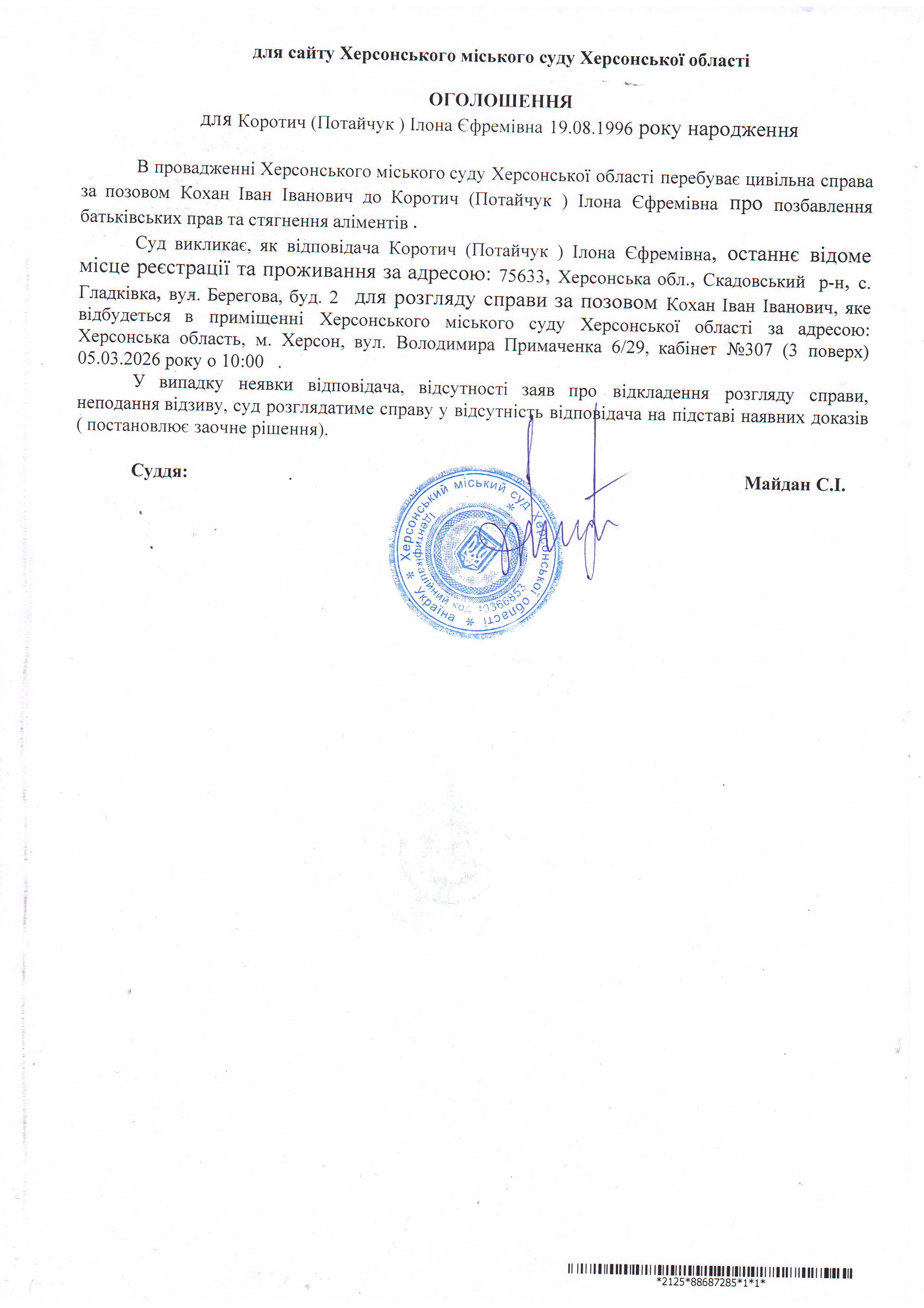 Оголошення для Коротич (Потайчук) Ілони Єфремівни