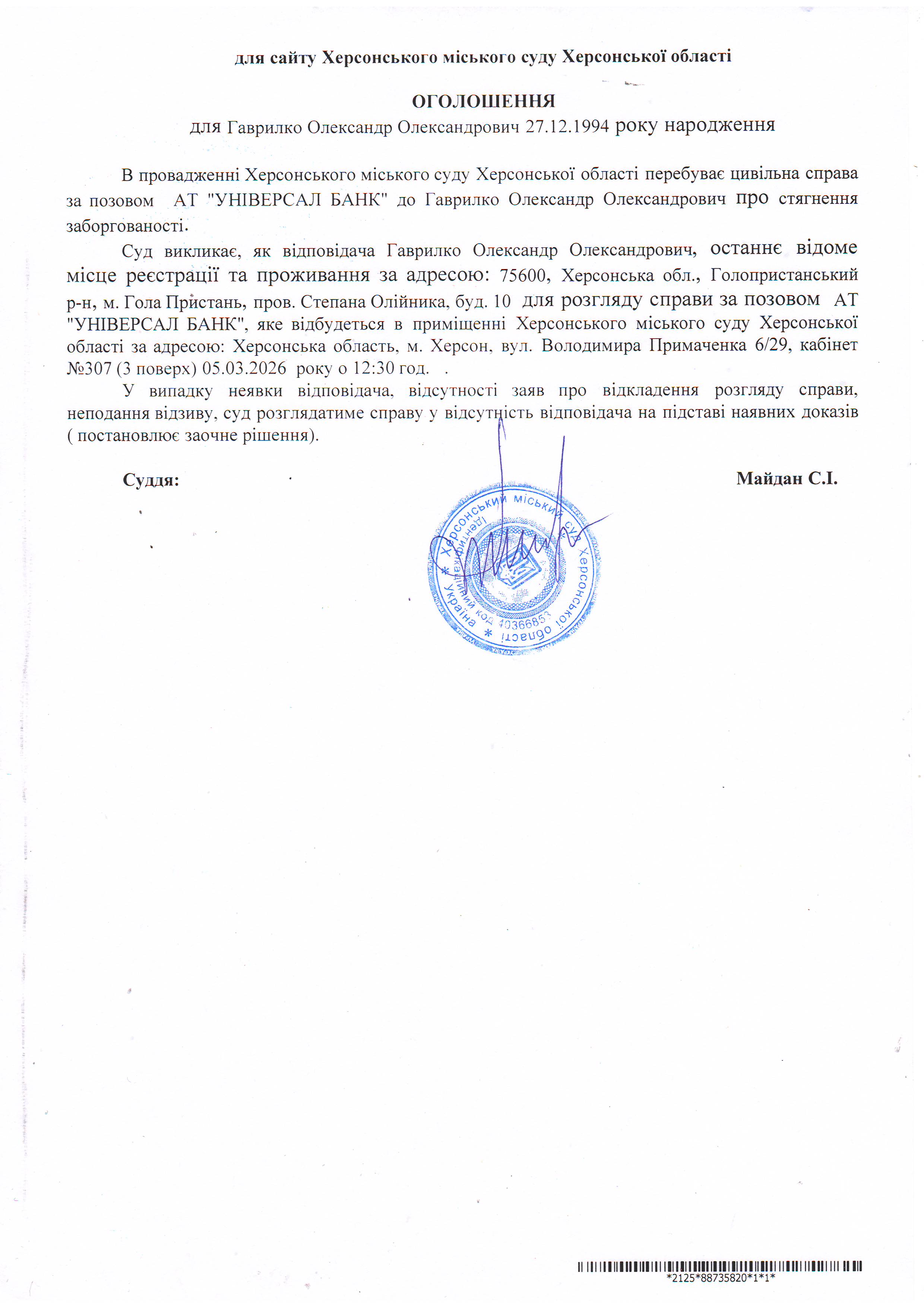 Оголошення для Гаврилка Олександра Олександровича