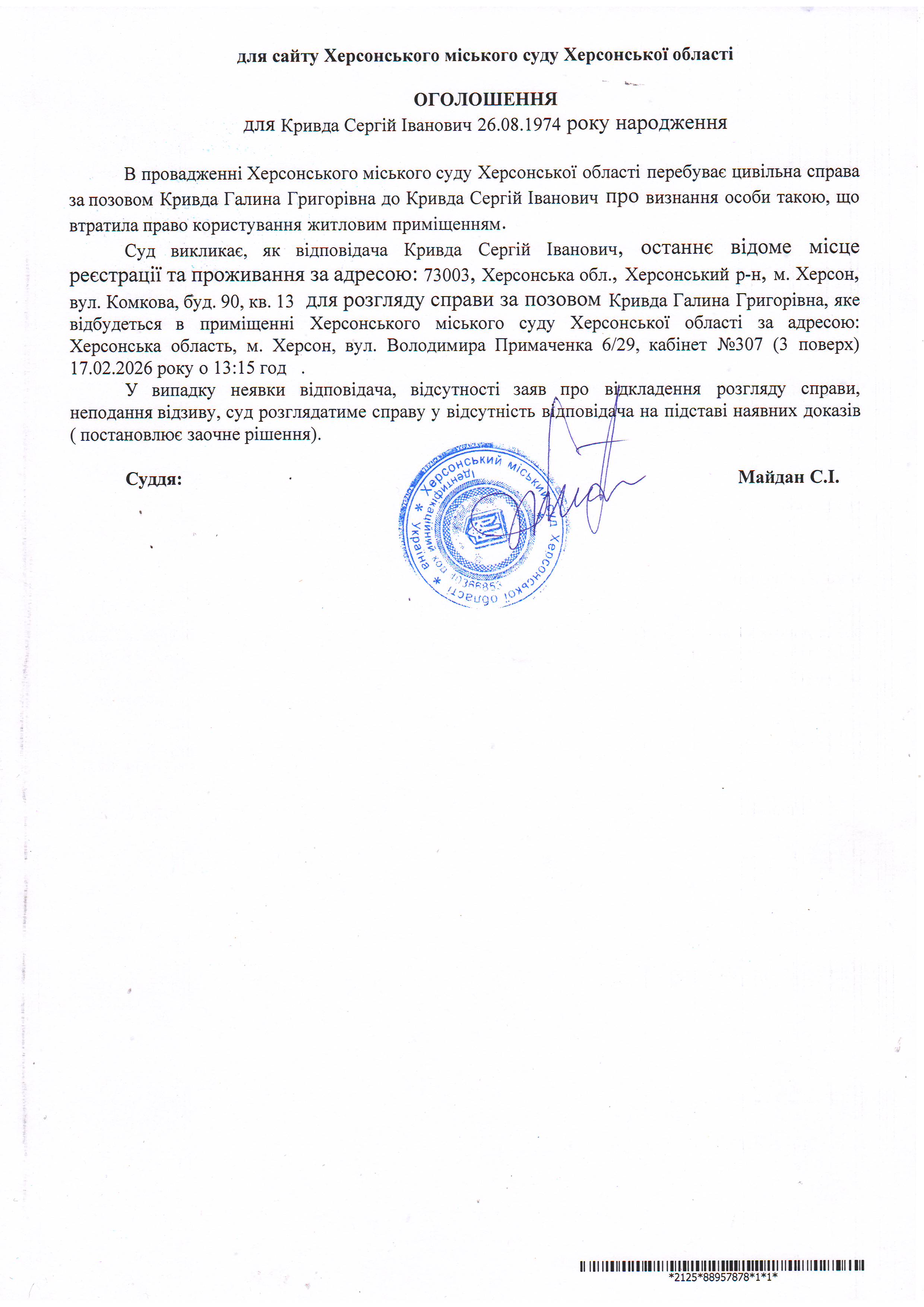 Оголошення для Кривди Сергія Івановича