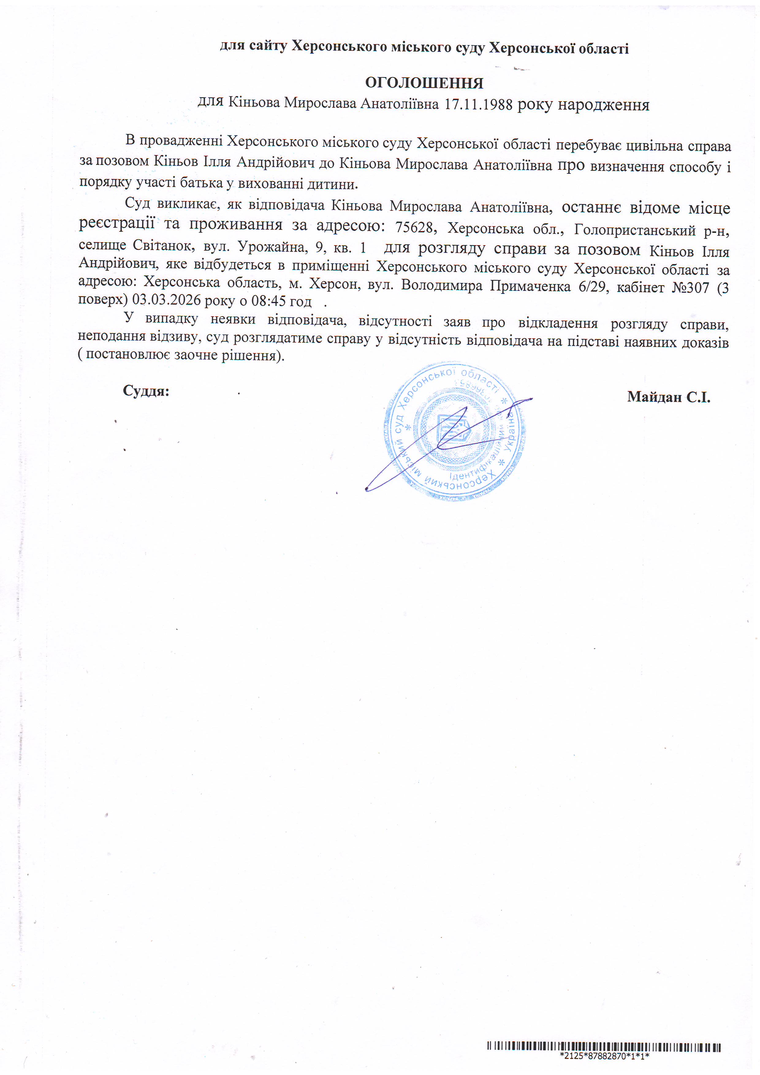 ОГОЛОШЕННЯ ПРО ВИКЛИК ДО СУДУ