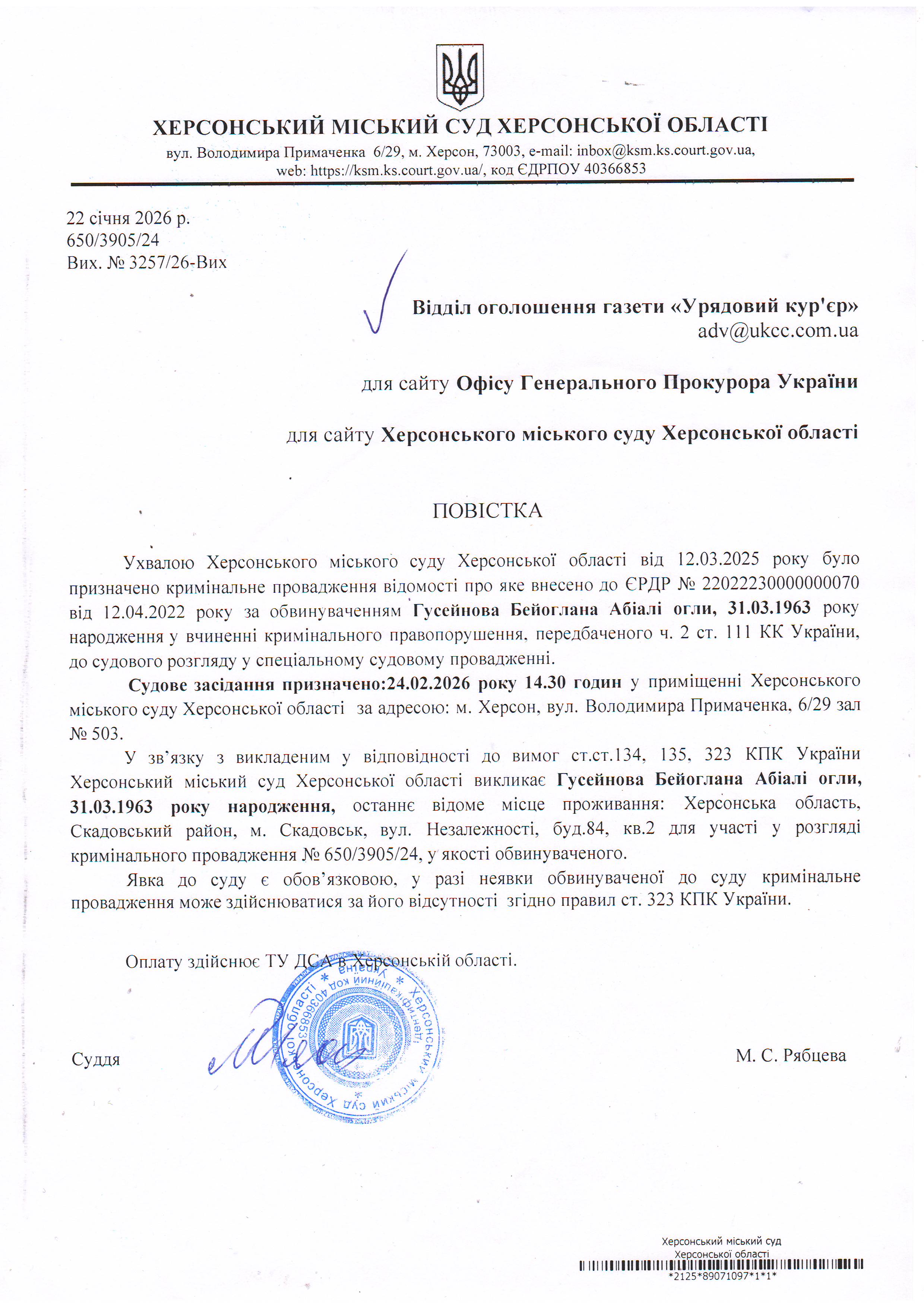 Оголошення про виклик особи в суд та повідомлення про судове рішення