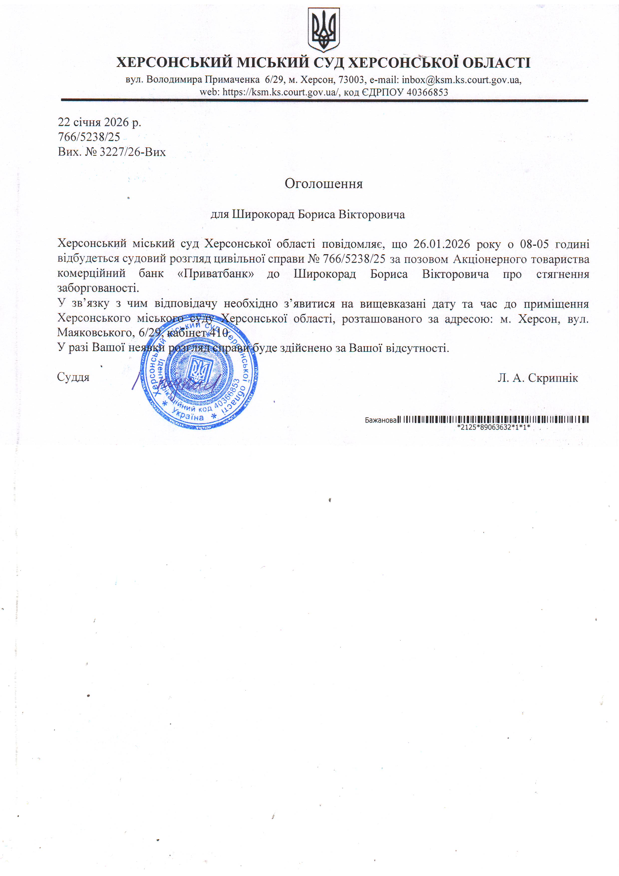 ОГОЛОШЕННЯ ПРО ВИКЛИК ДО СУДУ