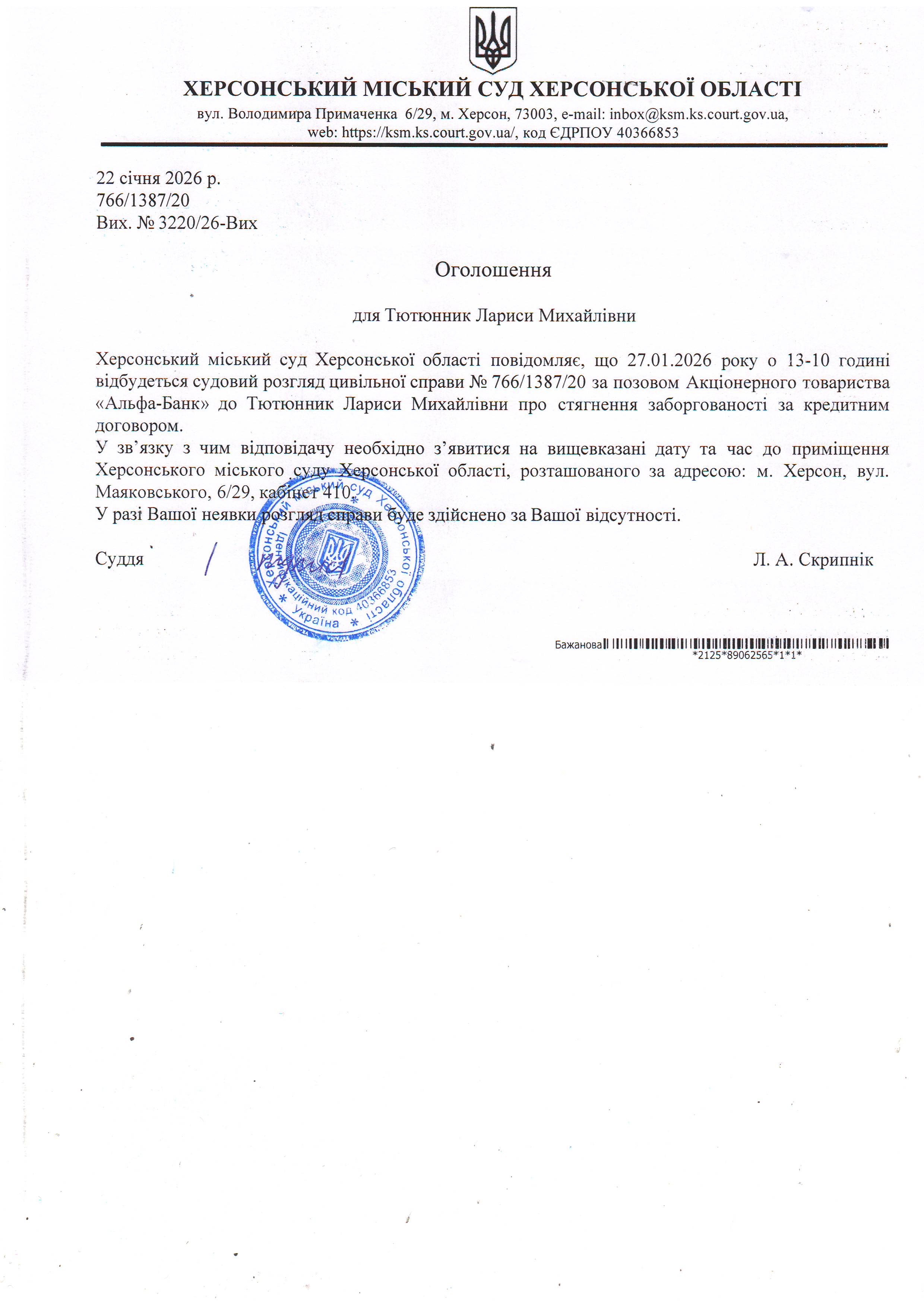 ОГОЛОШЕННЯ ПРО ВИКЛИК ДО СУДУ