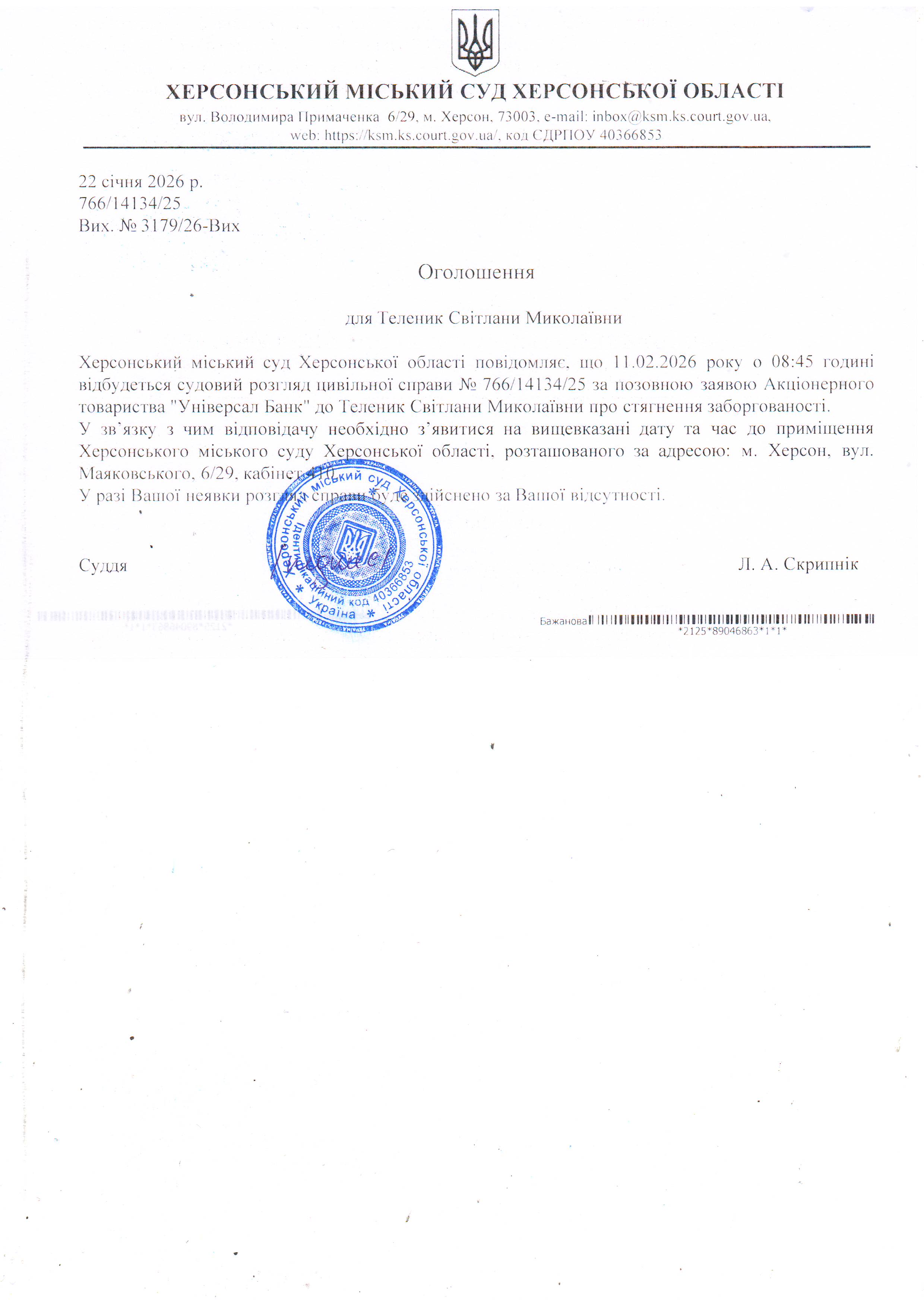 ОГОЛОШЕННЯ ПРО ВИКЛИК ДО СУДУ