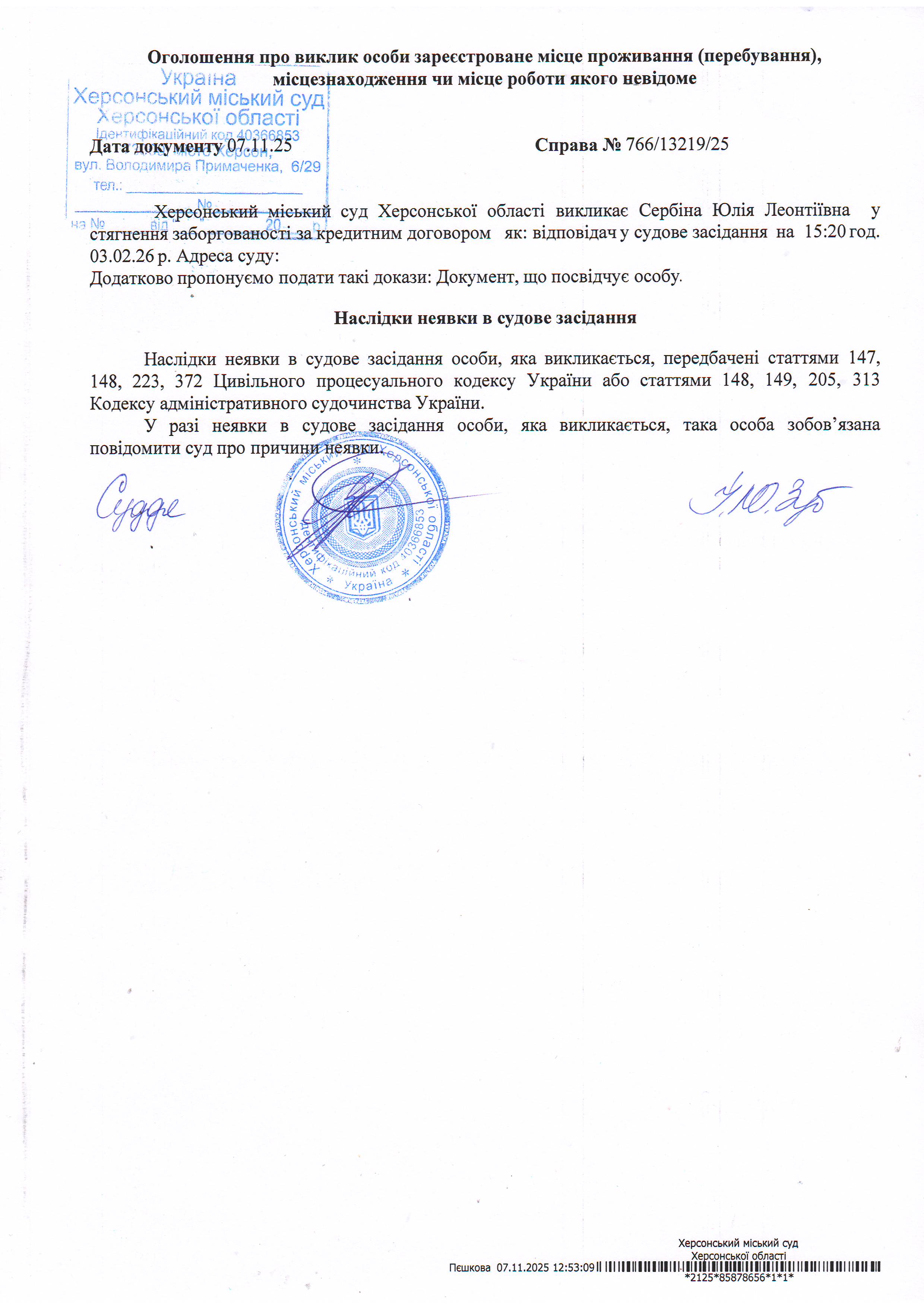 ОГОЛОШЕННЯ ПРО ВИКЛИК ДО СУДУ