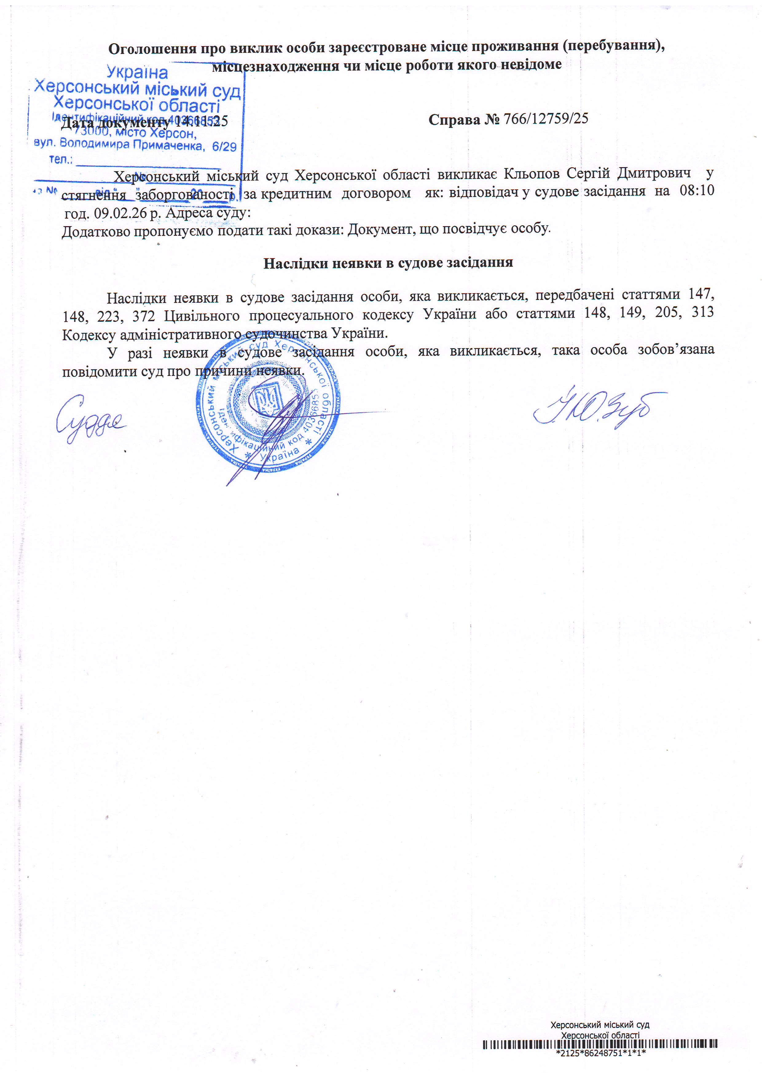 ОГОЛОШЕННЯ ПРО ВИКЛИК ДО СУДУ