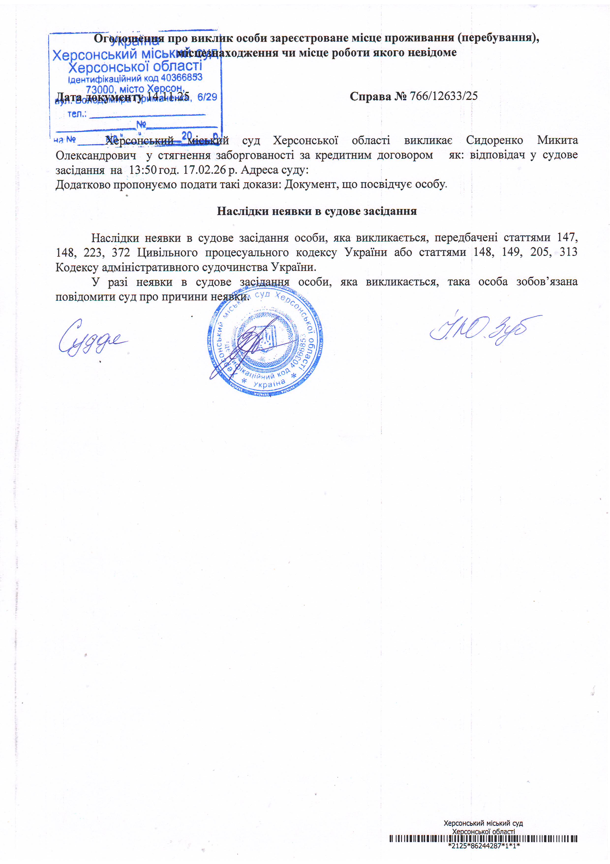 ОГОЛОШЕННЯ ПРО ВИКЛИК ДО СУДУ