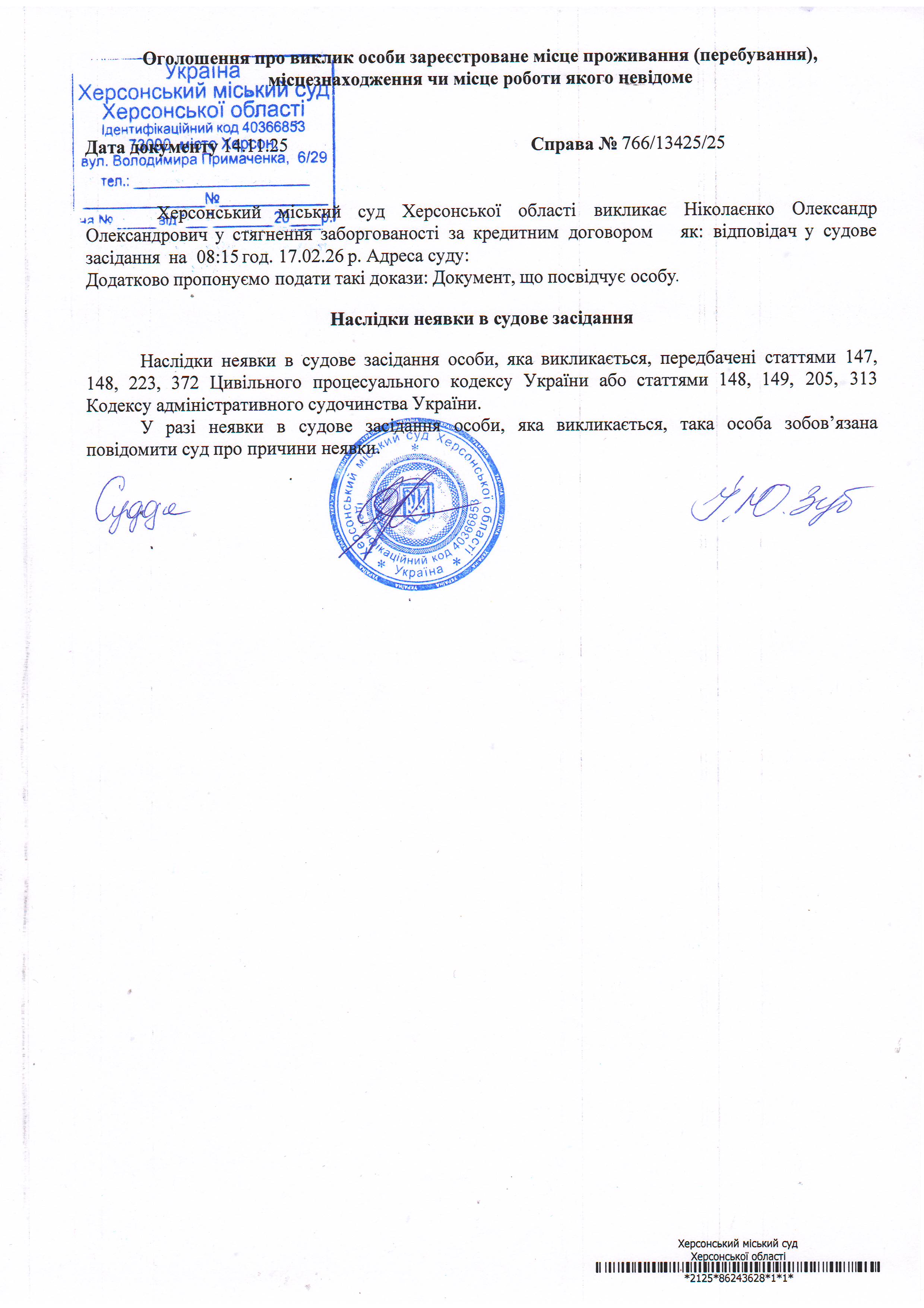 ОГОЛОШЕННЯ ПРО ВИКЛИК ДО СУДУ
