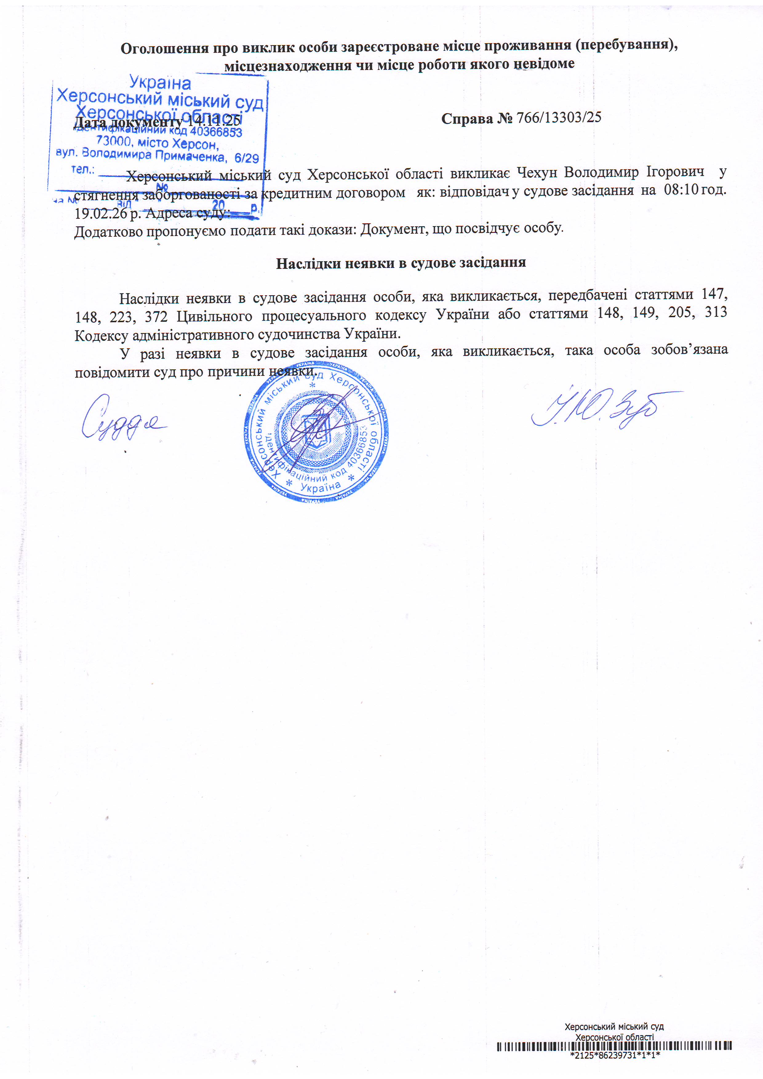 ОГОЛОШЕННЯ ПРО ВИКЛИК ДО СУДУ