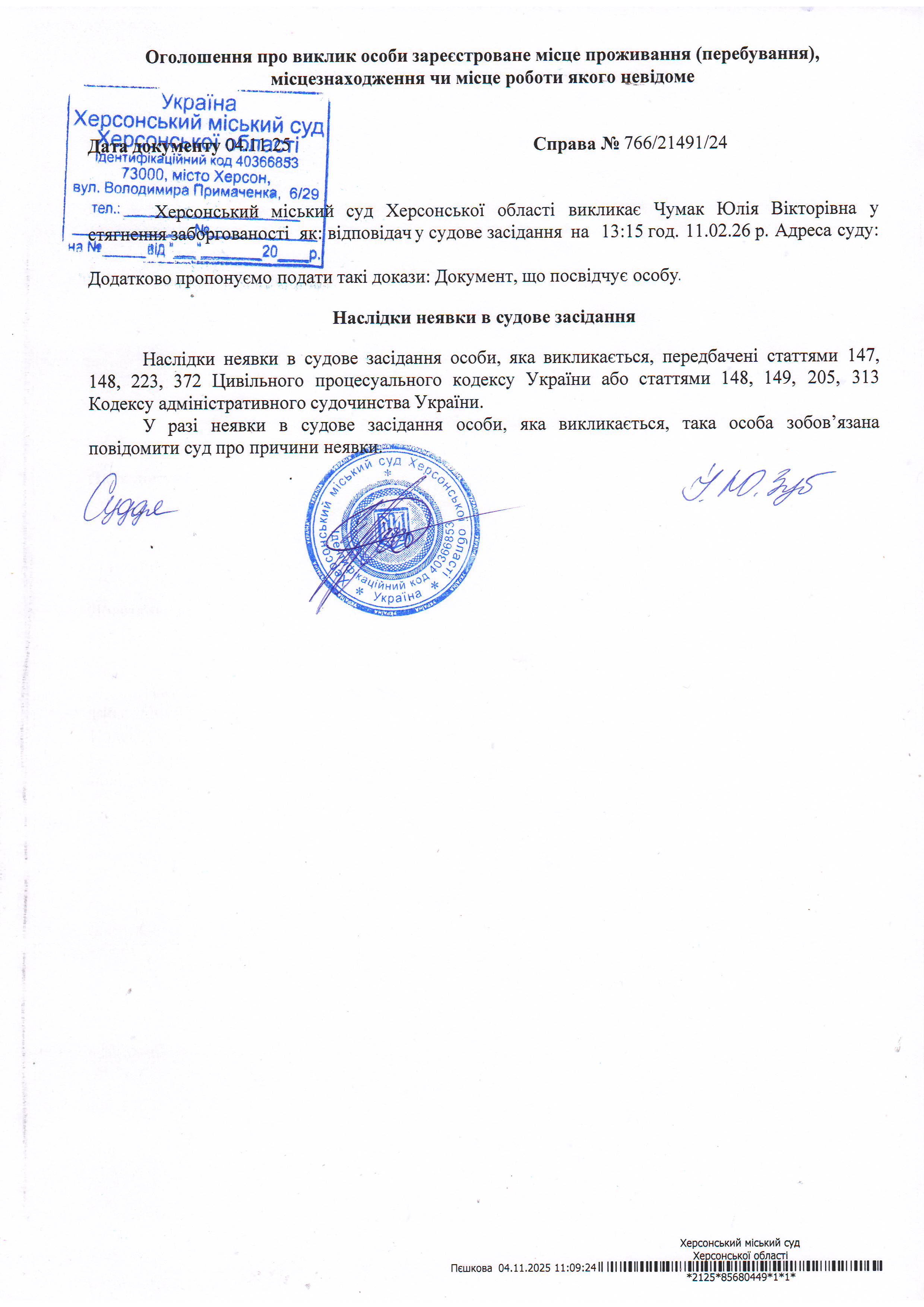 Оголошення про виклик особи в суд та повідомлення про судове рішення