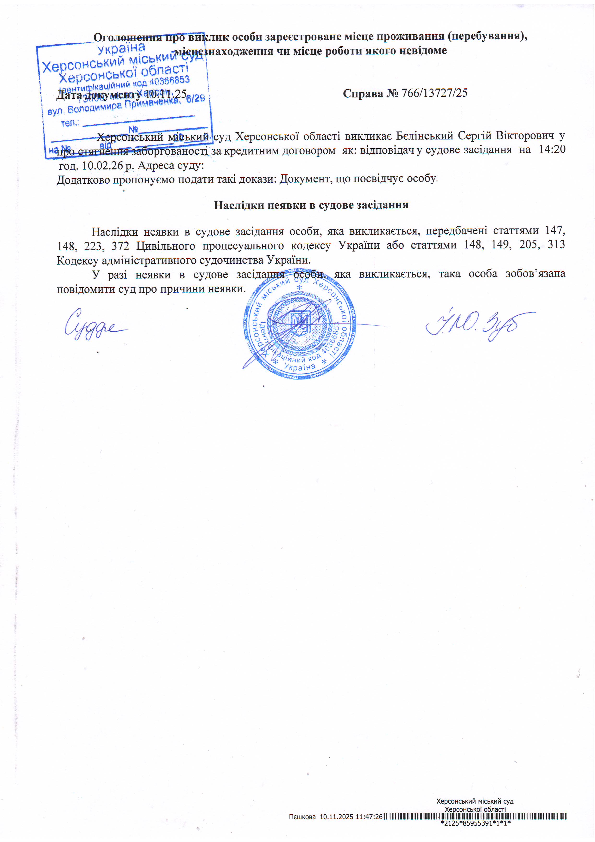 ОГОЛОШЕННЯ ПРО ВИКЛИК ДО СУДУ