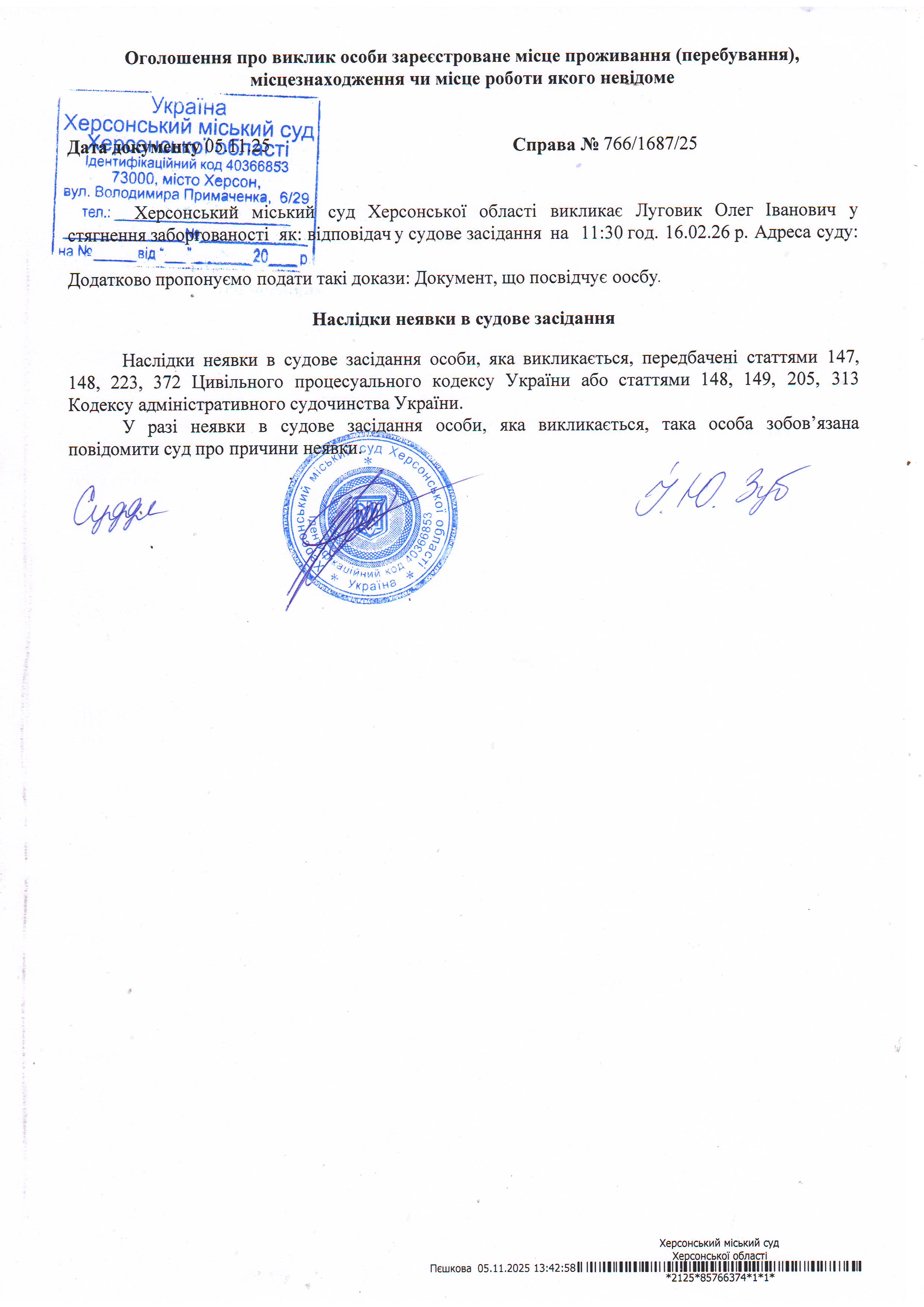ОГОЛОШЕННЯ ПРО ВИКЛИК ДО СУДУ