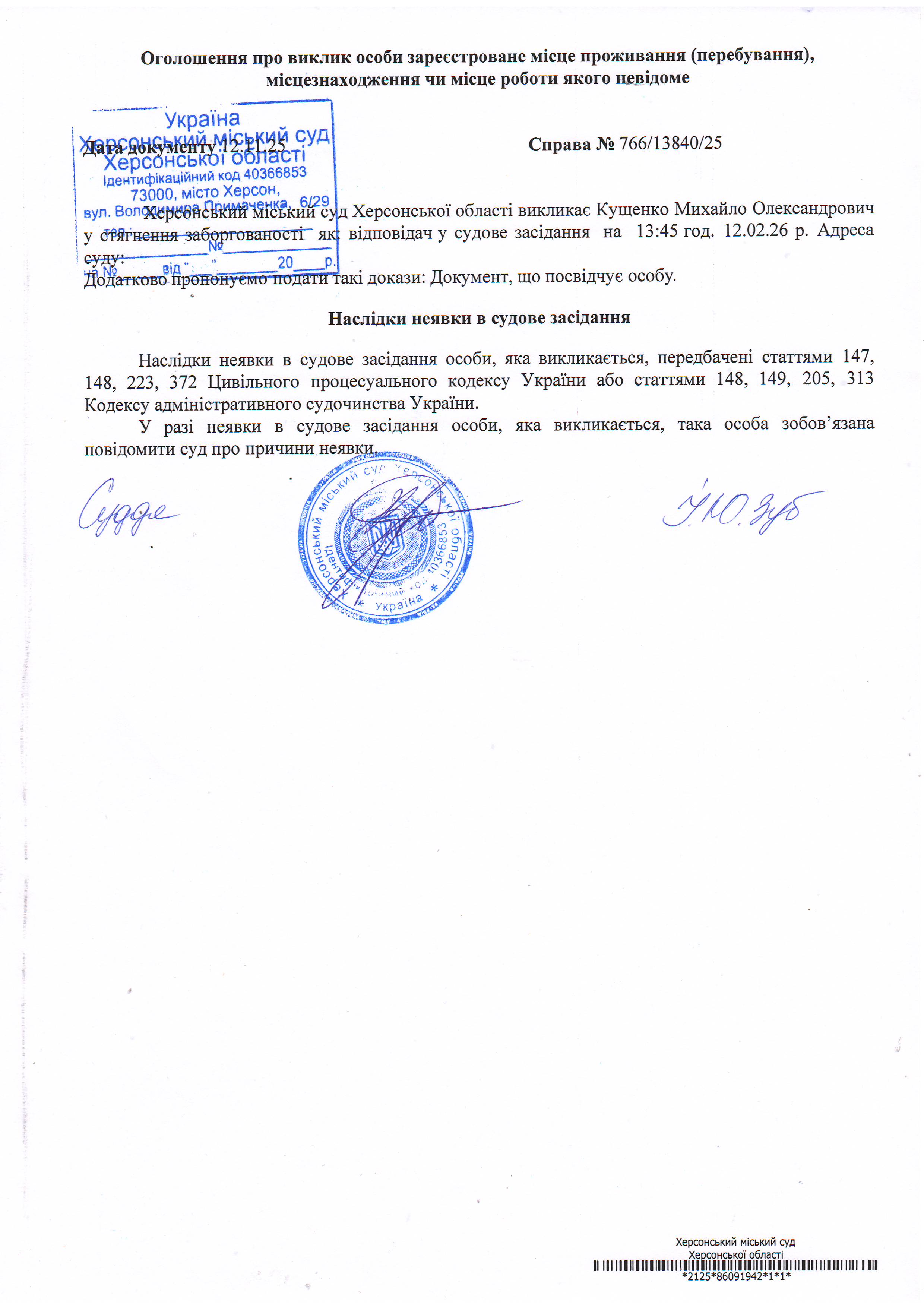ОГОЛОШЕННЯ ПРО ВИКЛИК ДО СУДУ